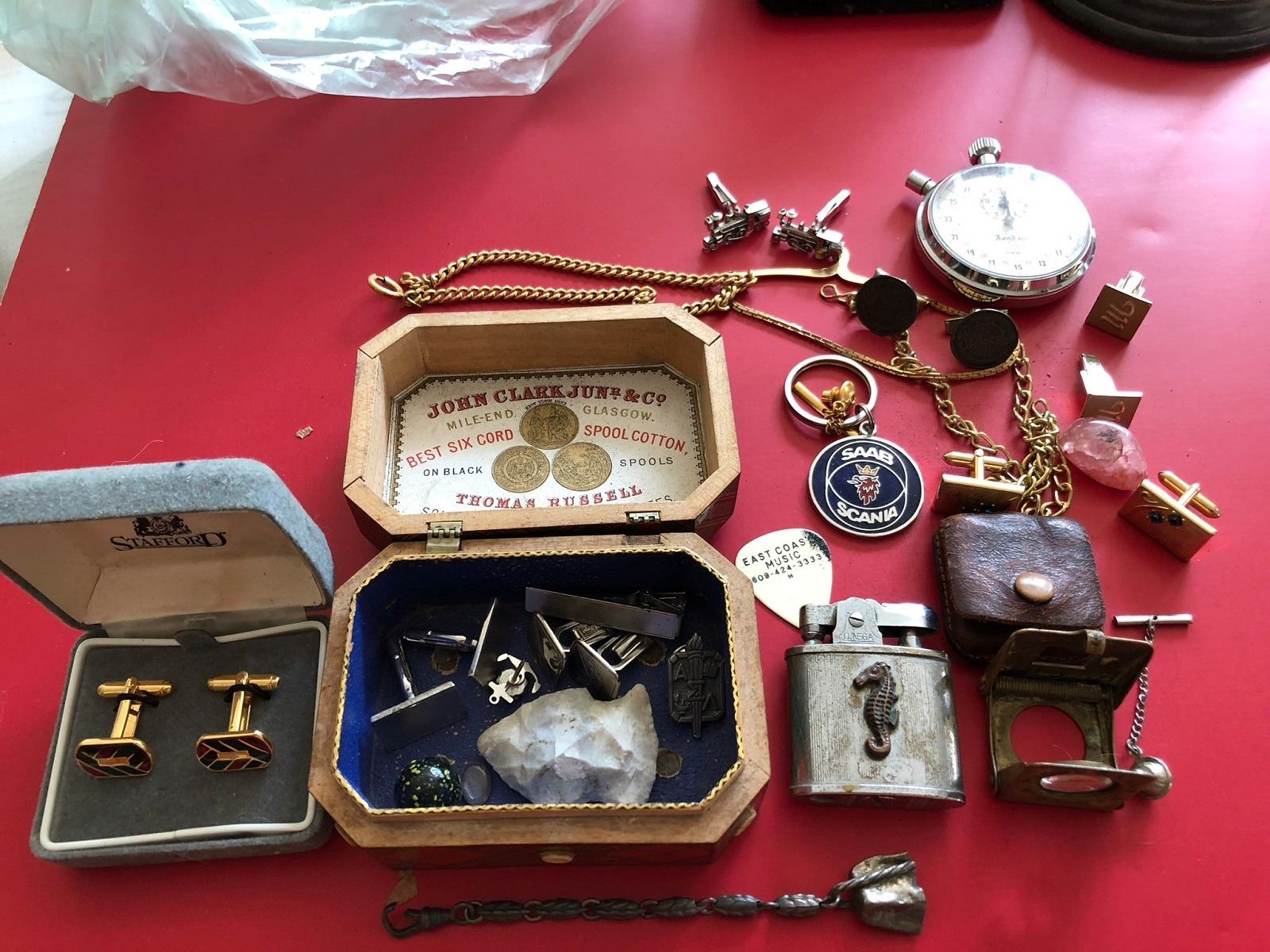 Estate collectible men's jewelry, lighter, early John Clark Junr. and Co. Silk Box, Watch case, cuff links, etc. (RM)