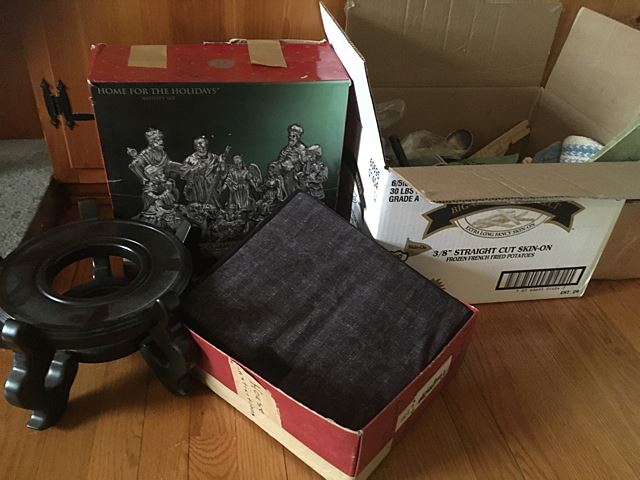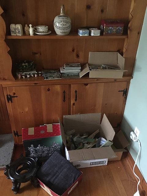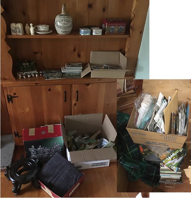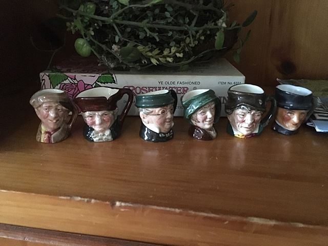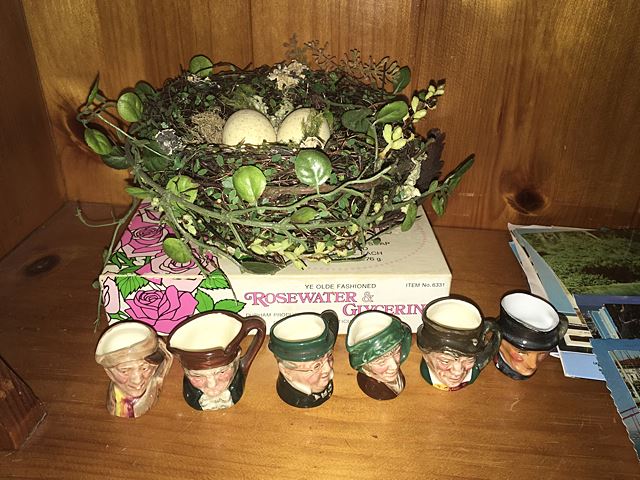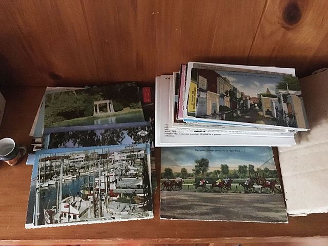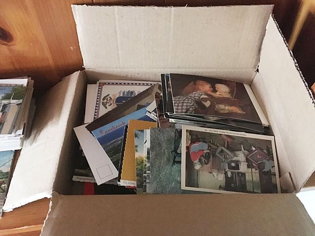 Estate Collectibles Lot includes miniature Tobies, very large post card collection, Japanese Figurines, Spode tea cup, Nativity Set, Jardineer stand, etc.