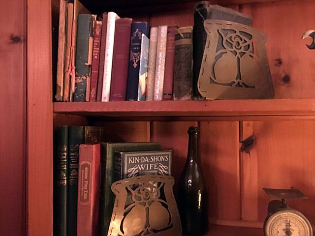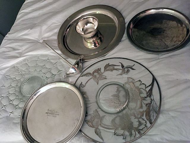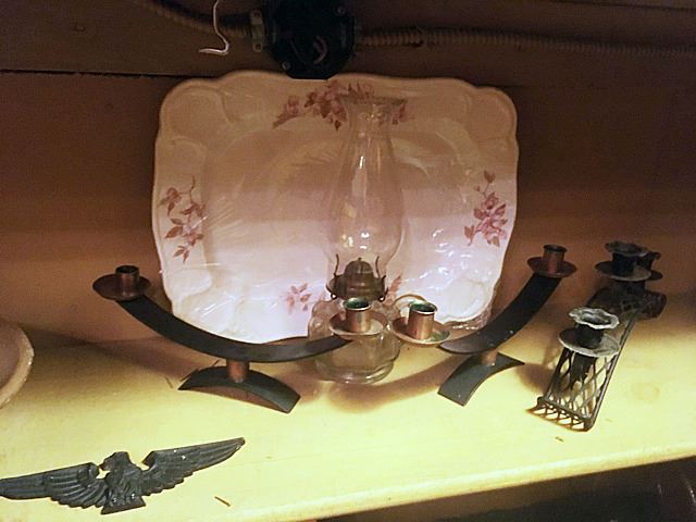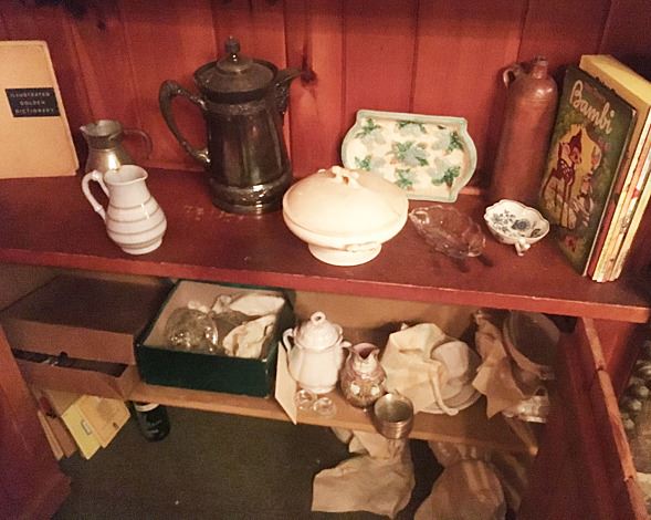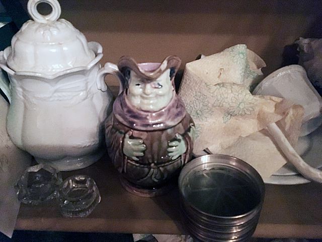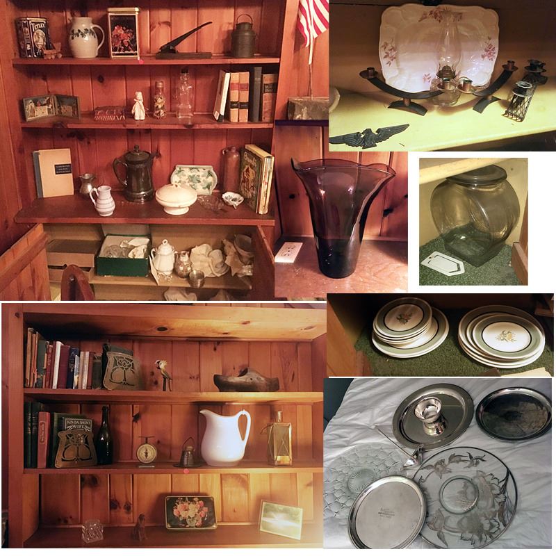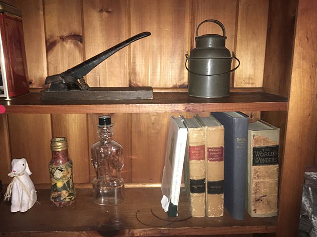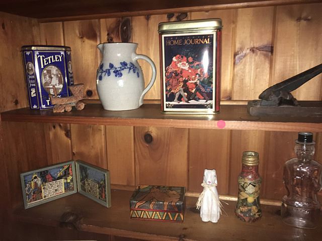Estate collectibles lot includes tins, stoneware jug, Toby, brass bookends, vintage wine stopper, small scale, peanut jar, candleabras, silverplate trays including Betty Crocker award tray, wooden bowls, small scale, lanterns, ironware, oil lamp, purple glass vase, Disney books, etc. all from the farm!