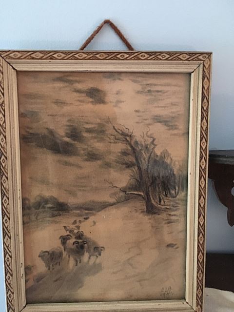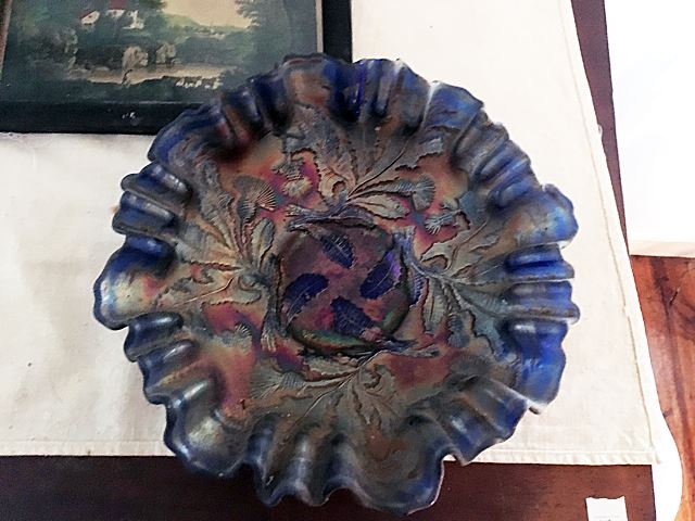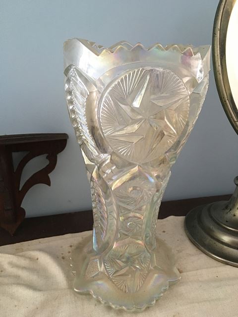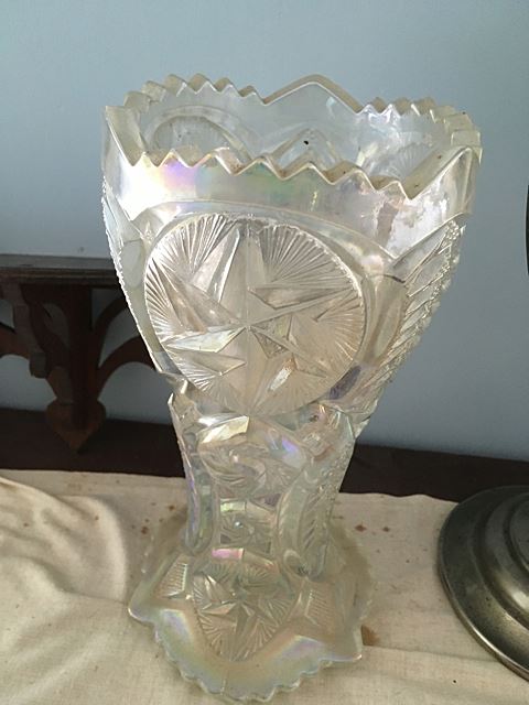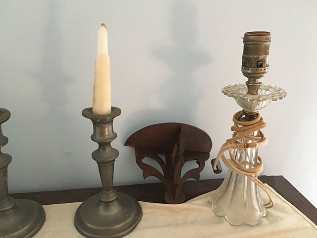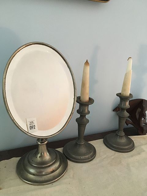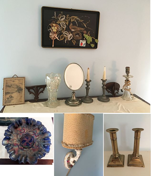 Estate collectibles lot includes white carnival glass vase, toleware, vintage mirror, and wall lamp. Queen Anne push up candle sticks, very early (1780-1810), Carnival Glass Bowl with thistle pattern, glass lamp, candle stick pair, wall shelves, small pencile drawing, signed. This lot is from a 100 year old Farm House in Sharon, CT, at the estate of Mr. John Morgan, a prominate Connecticut farmer, whose family has owned and farmed at this location for over 50 years. This lot can be picked up in Sharon CT for local buyers, or our shipper can pick up and ship to your location.