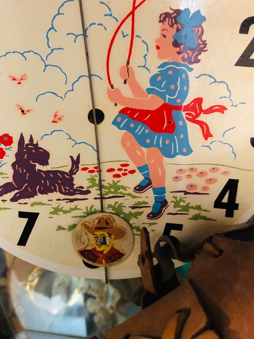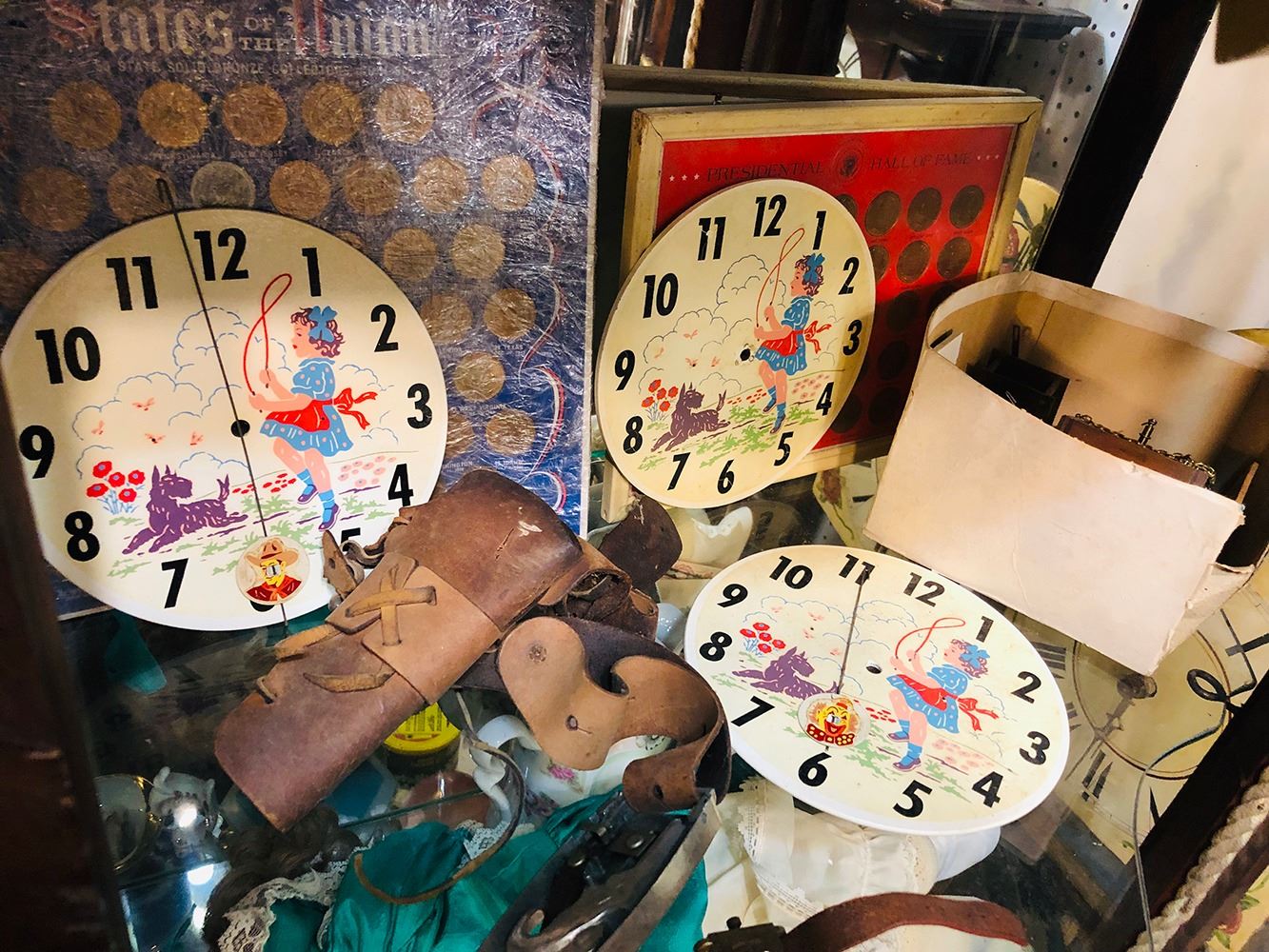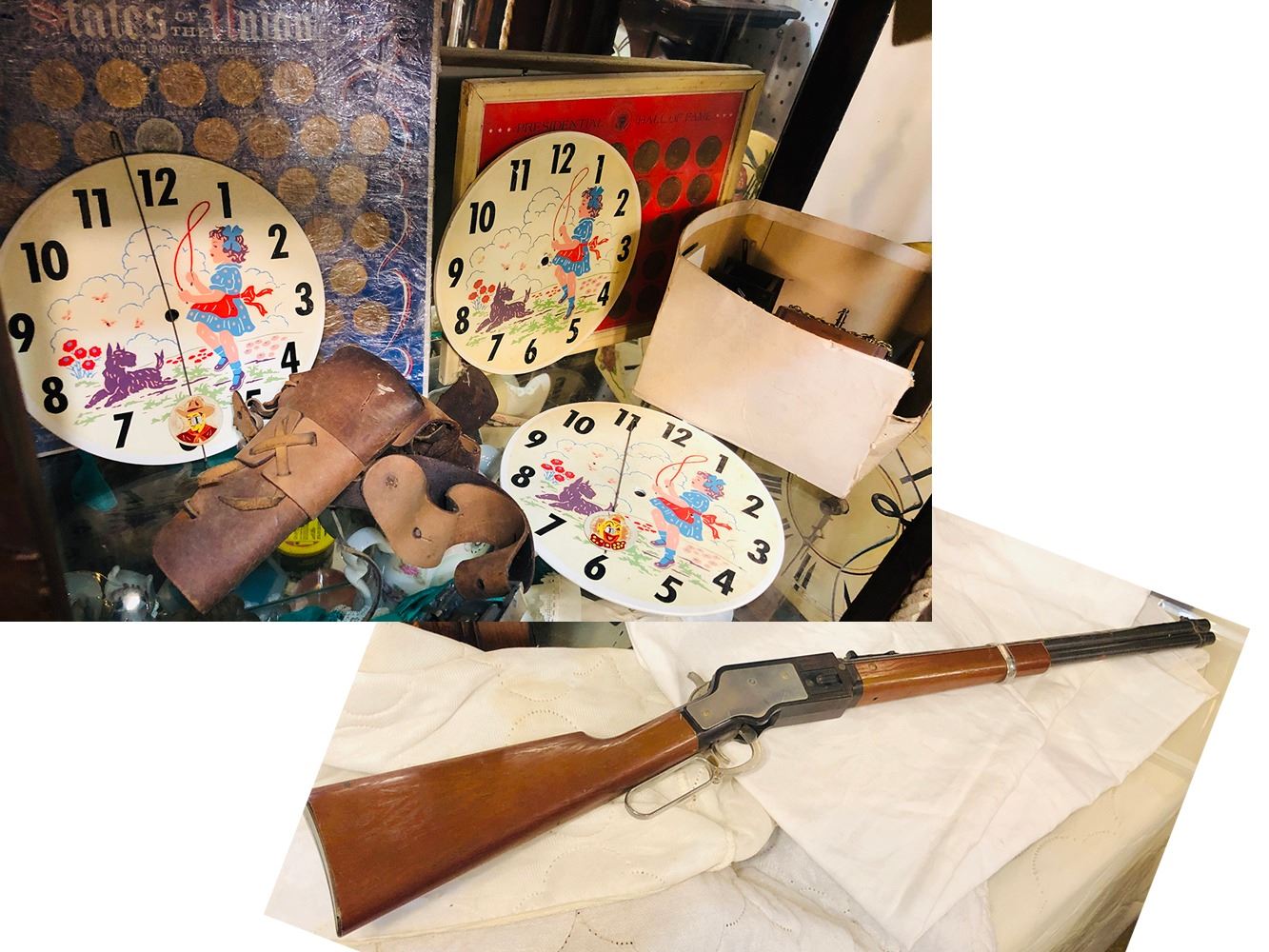 Estate collecibles includes 3 Hayer Childs Clocks, Roy Rogers toy holsters, Winchester toy gun, penny collection.