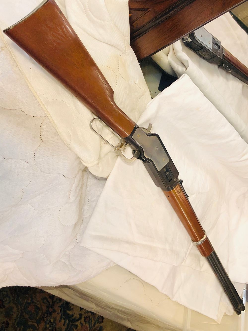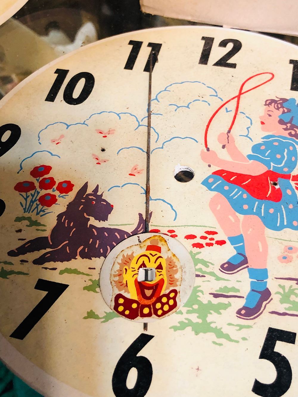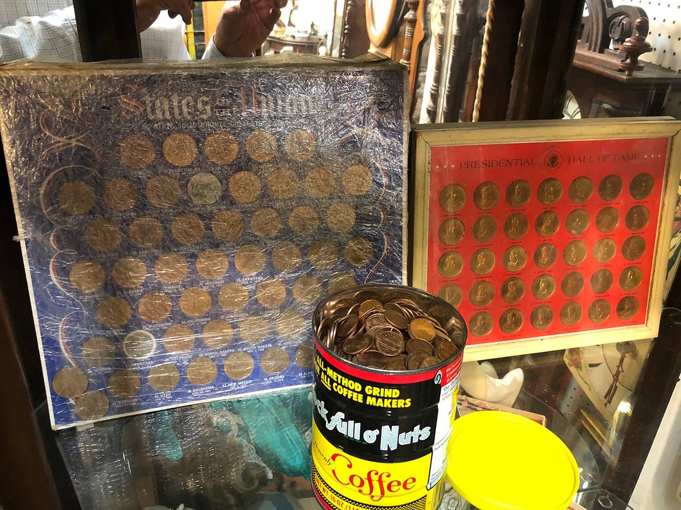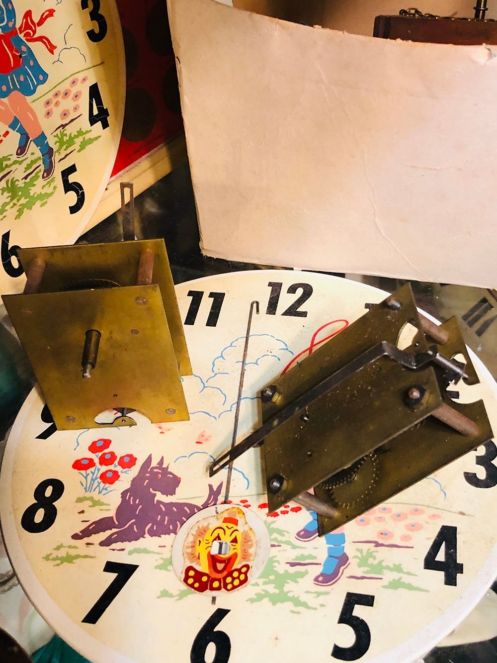 Estate collecibles includes 3 Hayer Childs Clocks, Roy Rogers toy holsters, Winchester toy gun, penny collection.