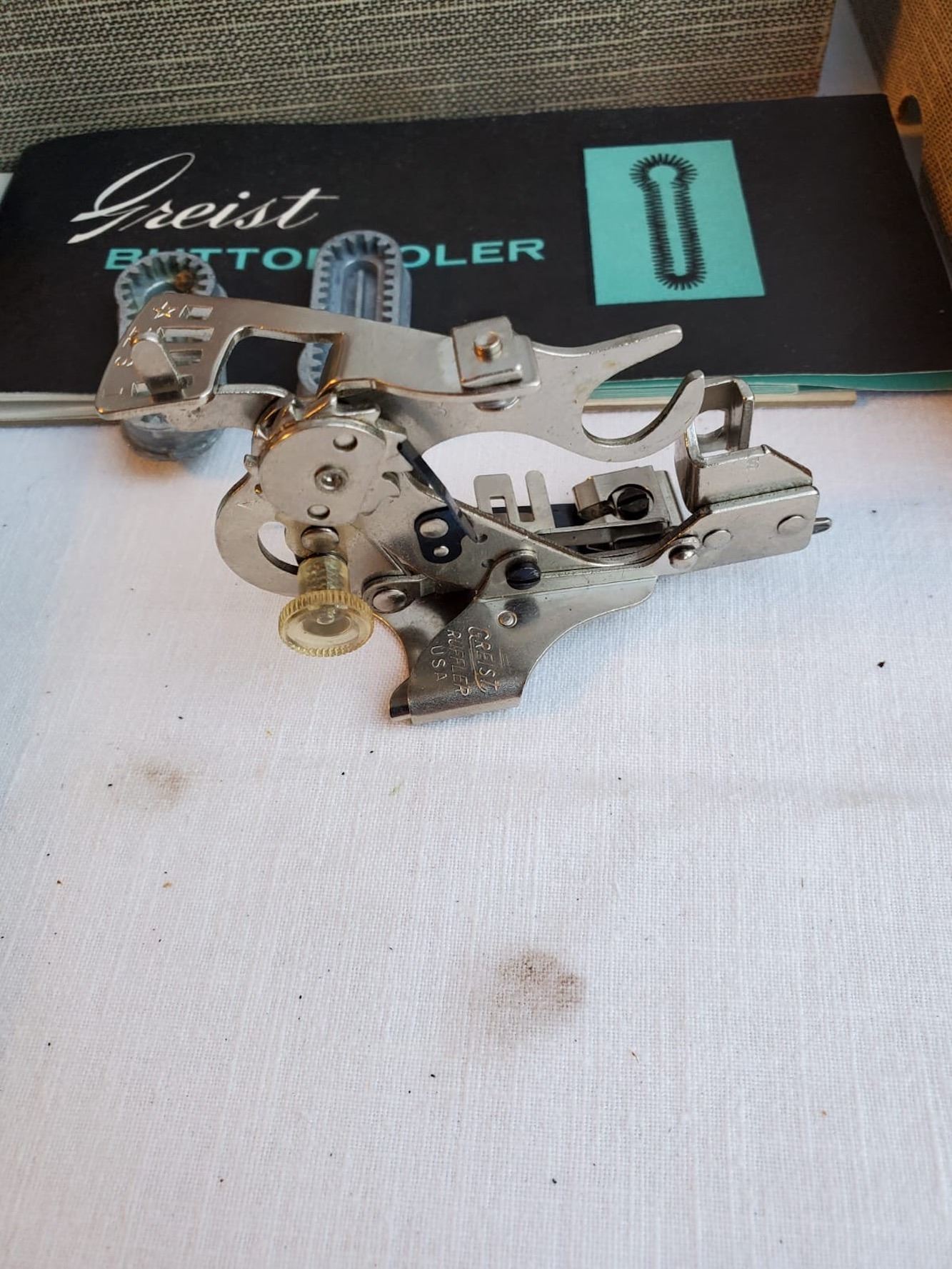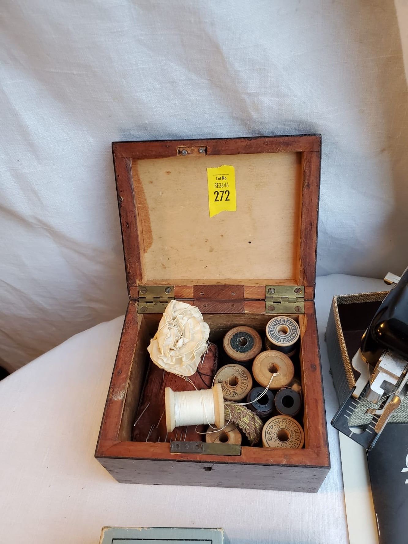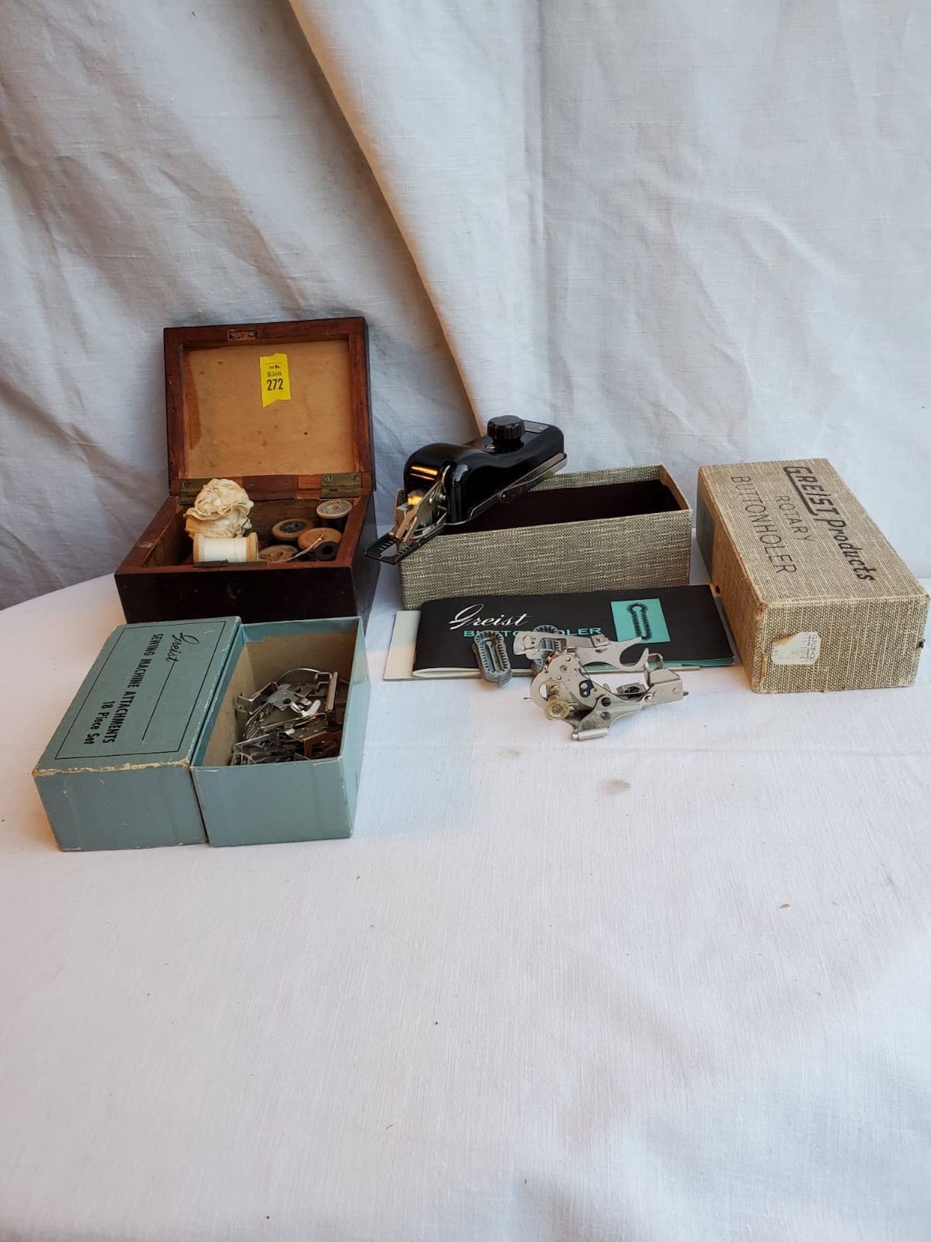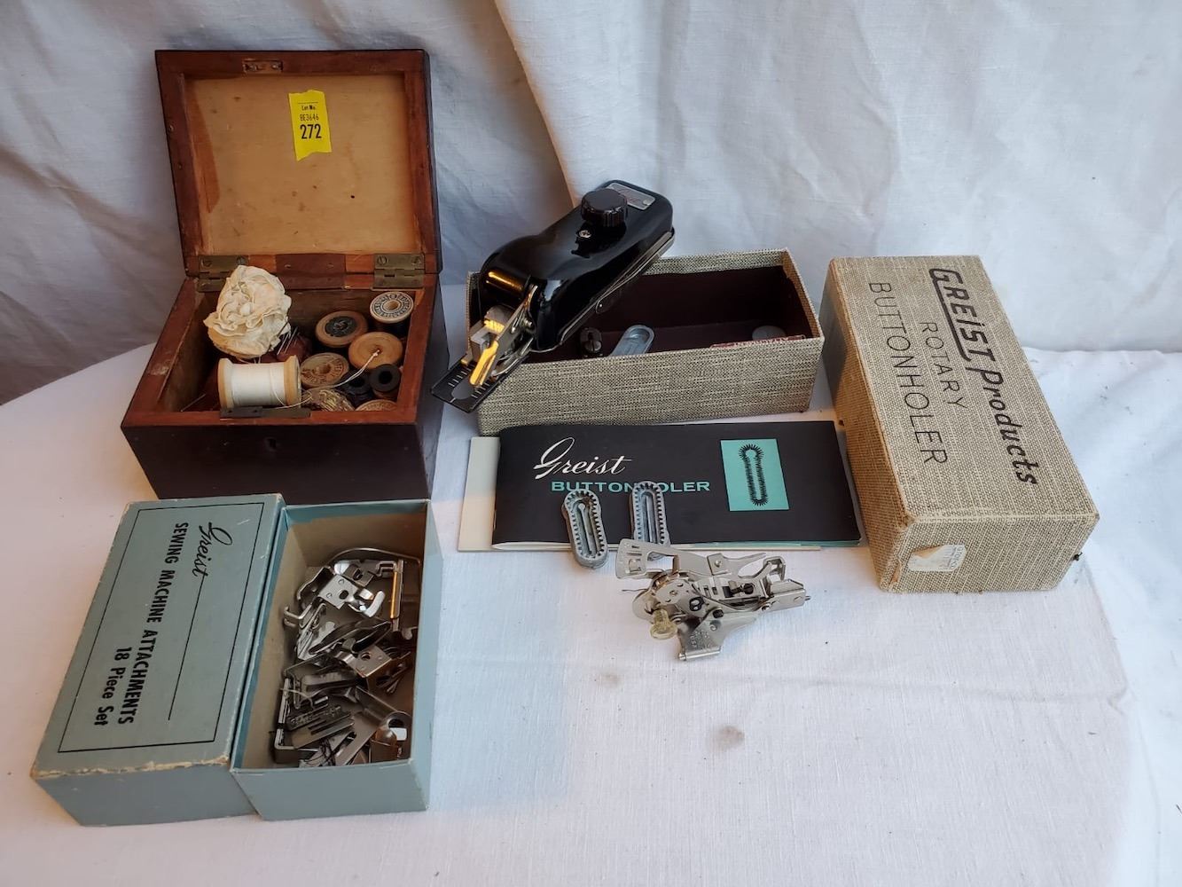 Estate collectibles including sewing items, button holer, zippers, thread, bobbins, etc.