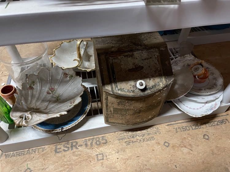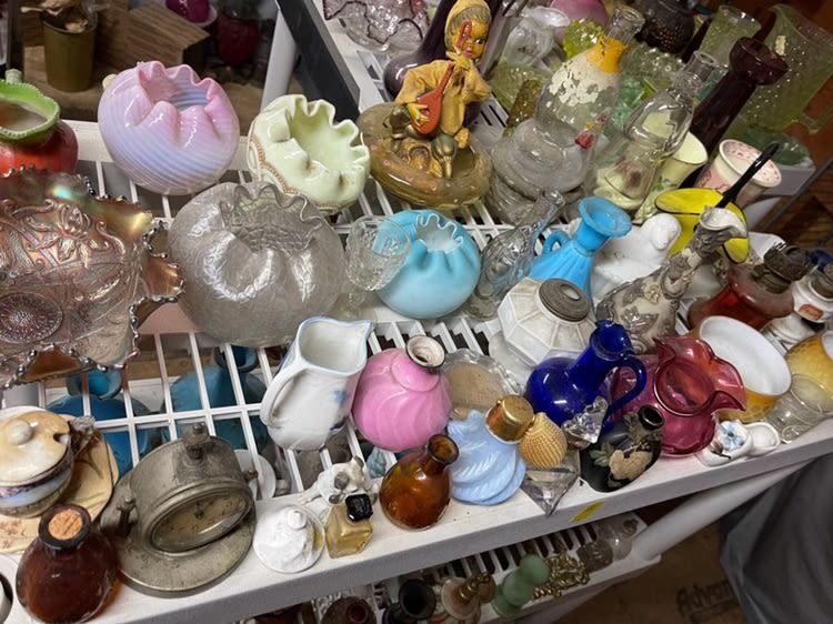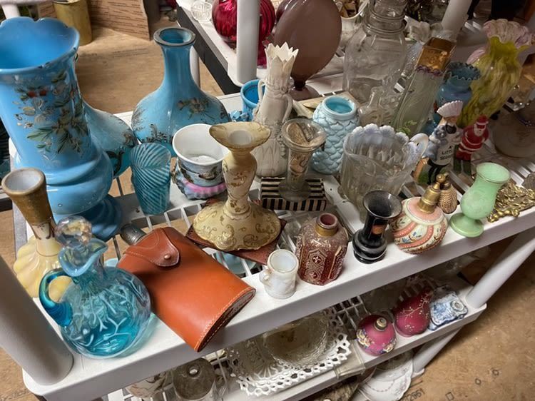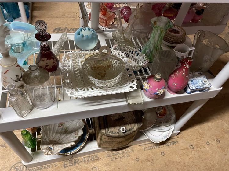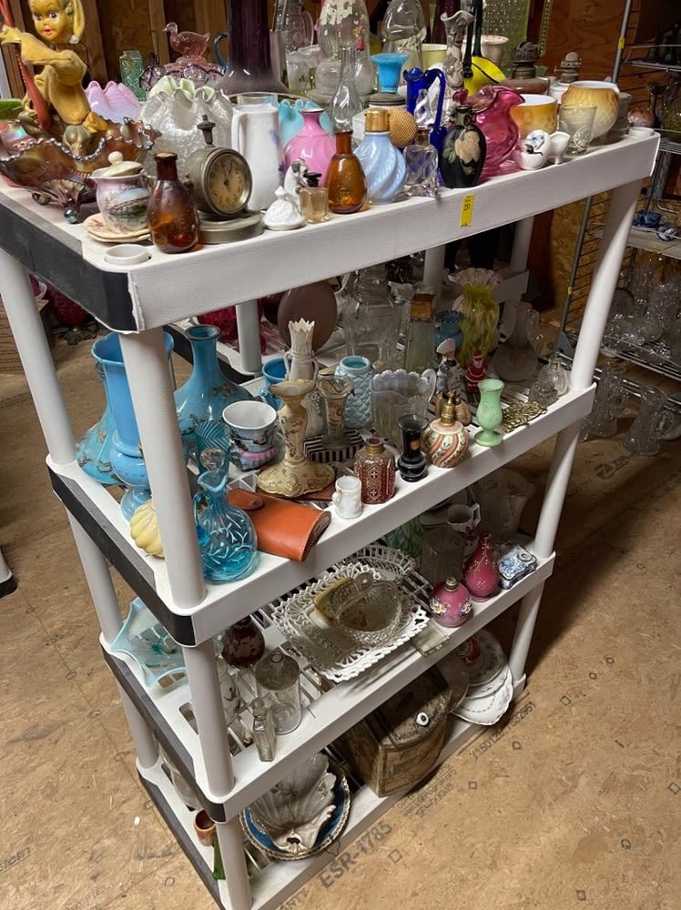 4 shelves full of estate collectibles all from the attic! Including Carvinal glass, art glass, figurines, porcelain, etc.