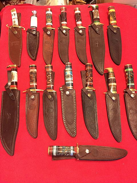 Nice estate collection of 15 buck/hunting knives, each with fancy handles.