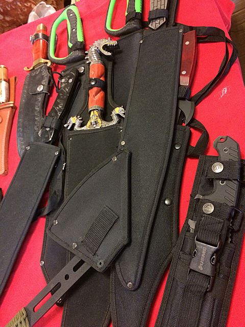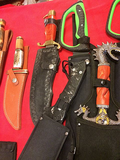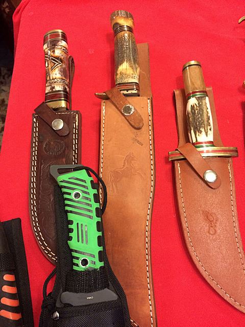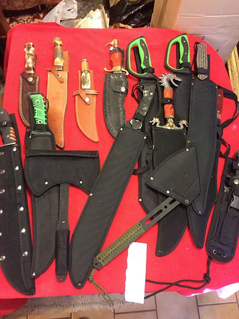 Nice estate collection of 15 buck/hunting knives, some with fancy handles, 1 axe, machette, and hatchet included. 1 knife has fancy dragon handle.