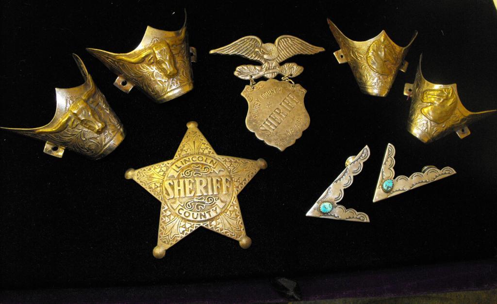 A lot with two Faux Sheriff's badges, two sets of boot tips, silver and turquoise collar tips. All vintage items.