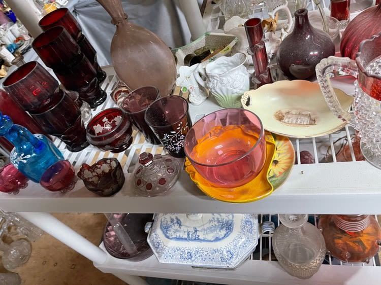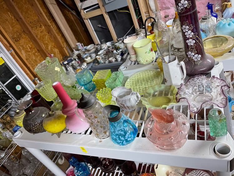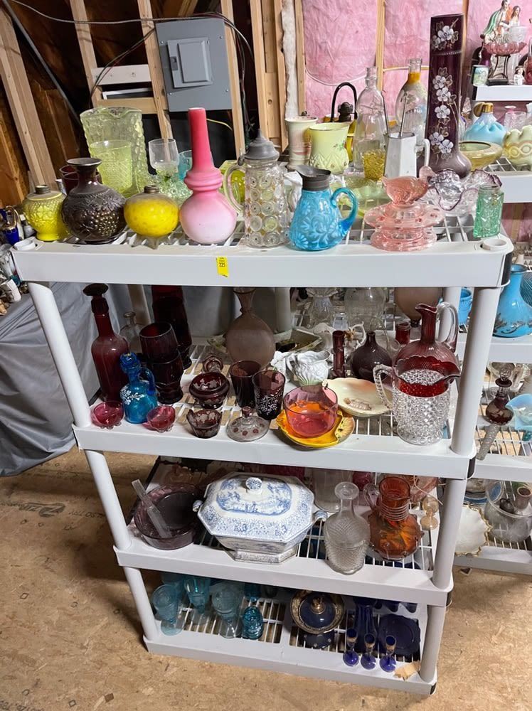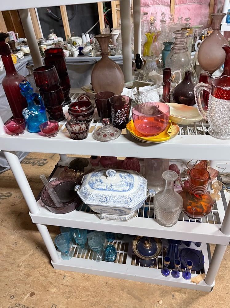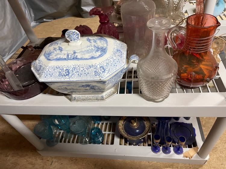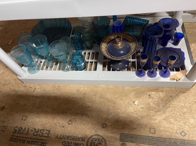 4 shelves full! Estate collection of glassware, including blue glass, cobalt blue, ruby, Depression, covered tureen, etc. All from the attic! Being sold for 1 monies!