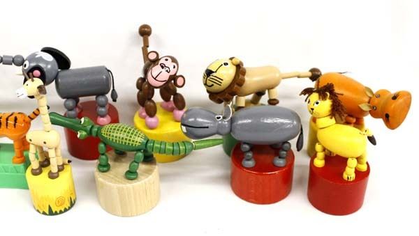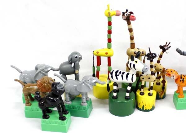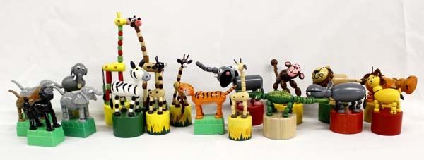 Hummert Estate: Large Collection of Vintage Jungle Push Puppets, largest measures, includes wood and plastic puppets, most are made in the Czech Republic for Petra Toys, 7.5''H, includes giraffes, elephants, lions, zebra, tiger, gorilla, hippos, crocodile, and a monkey, includes 19 pieces in all