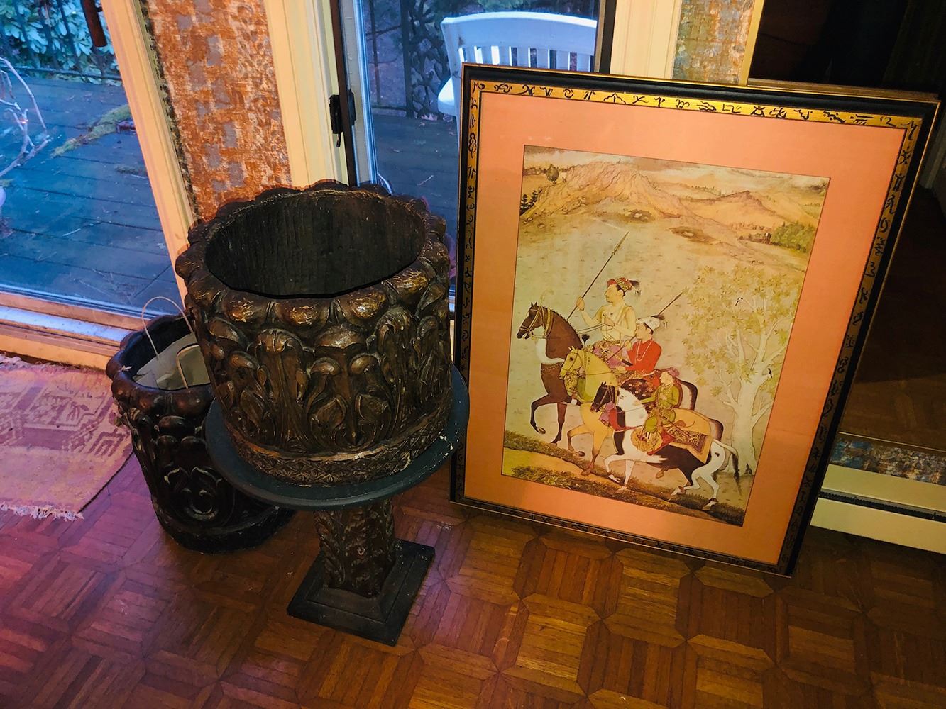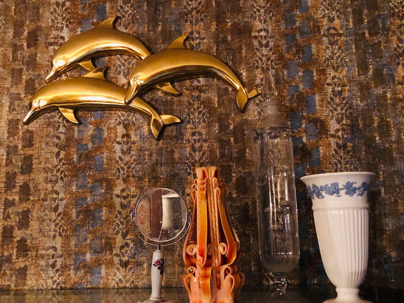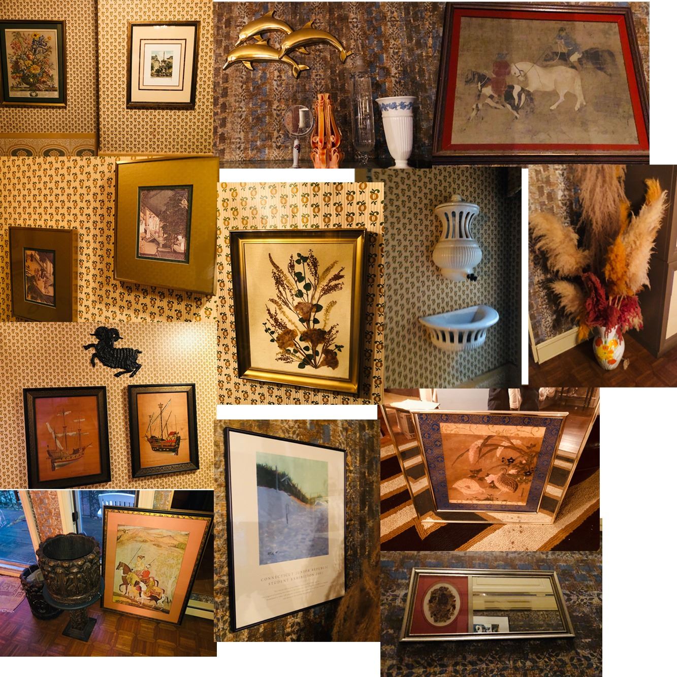 Estate lot including wall art, prints, dried flower art, water fountain, dolphins, vases, etc.