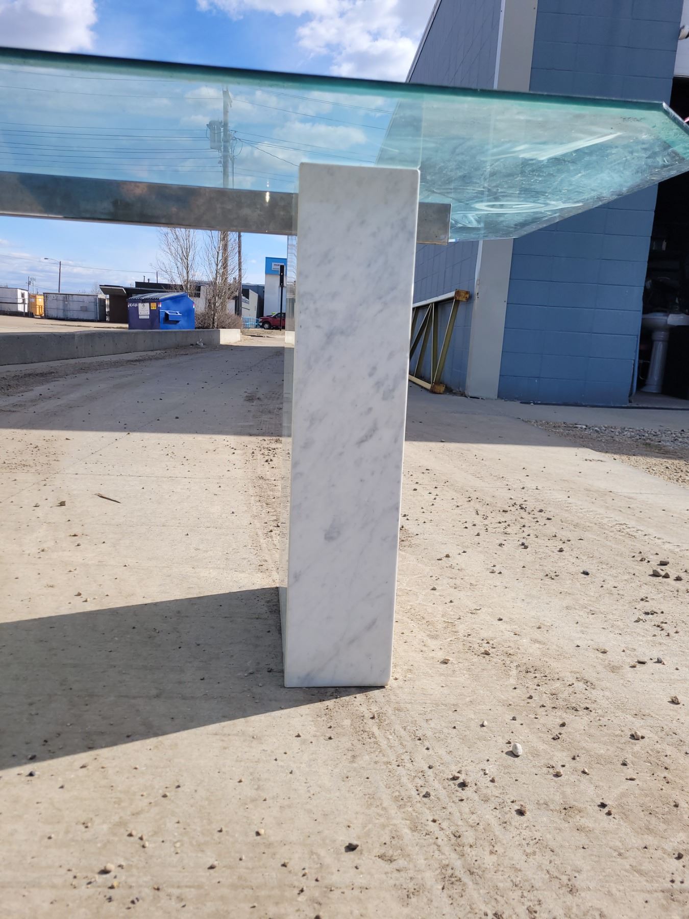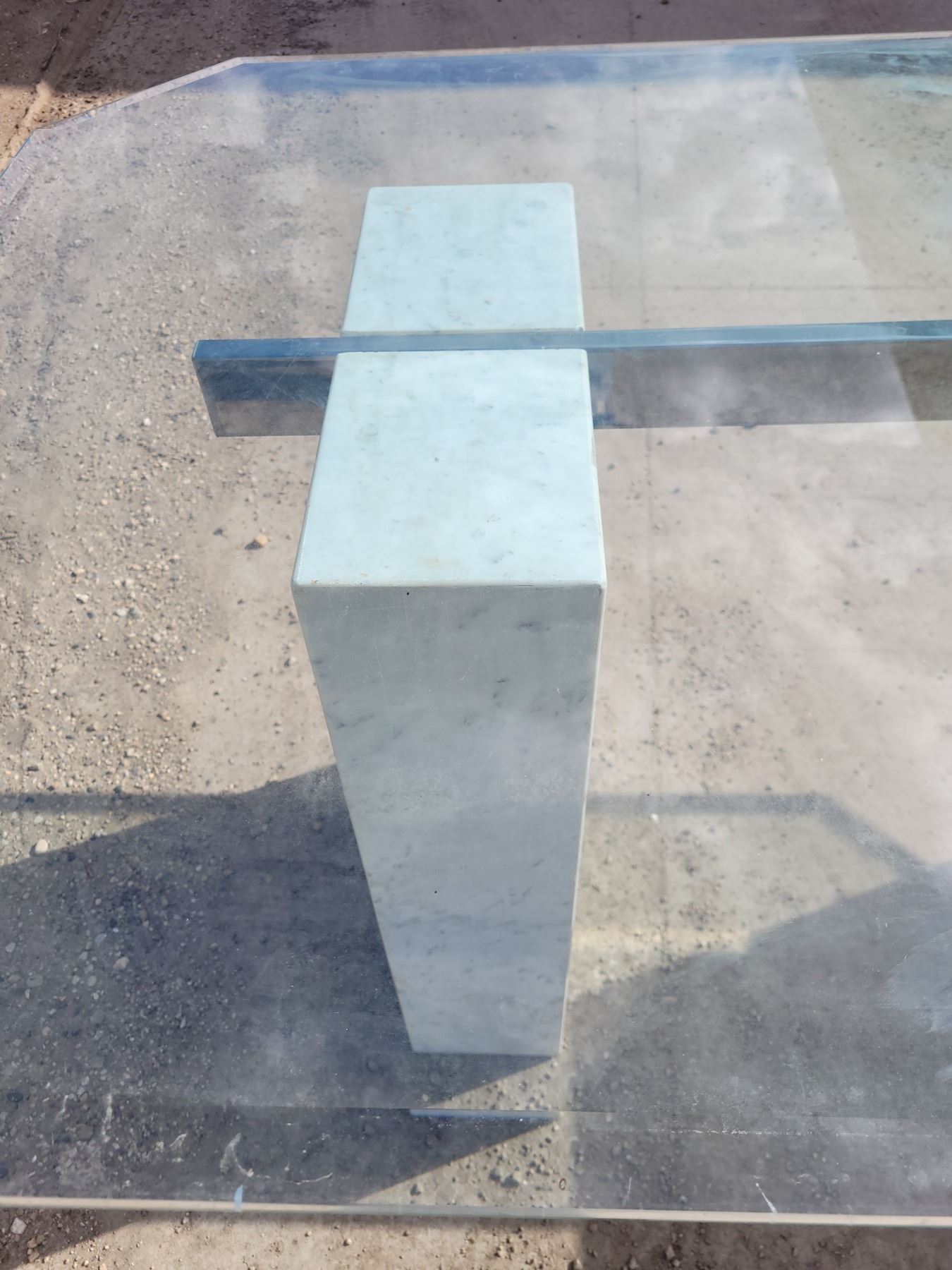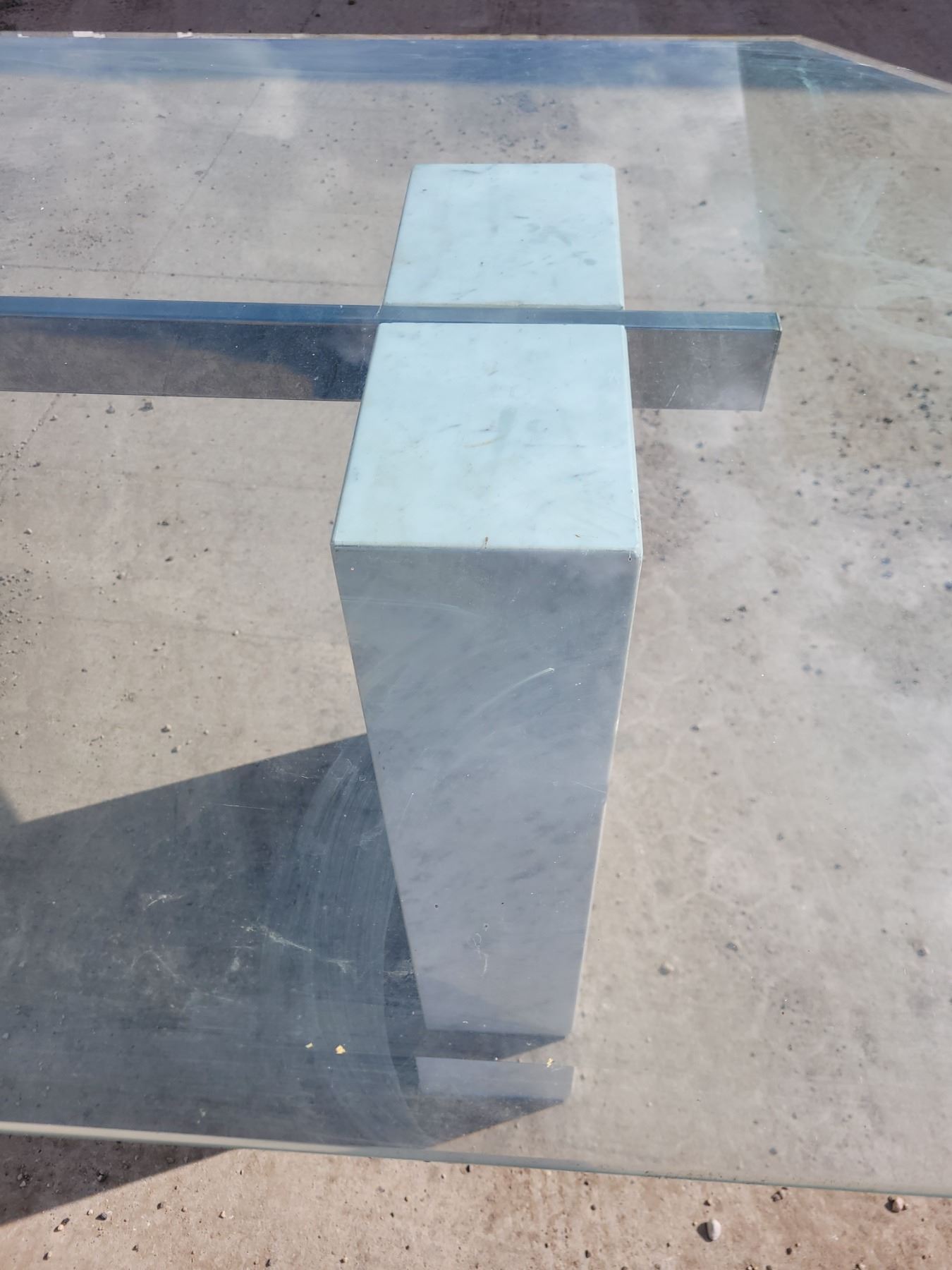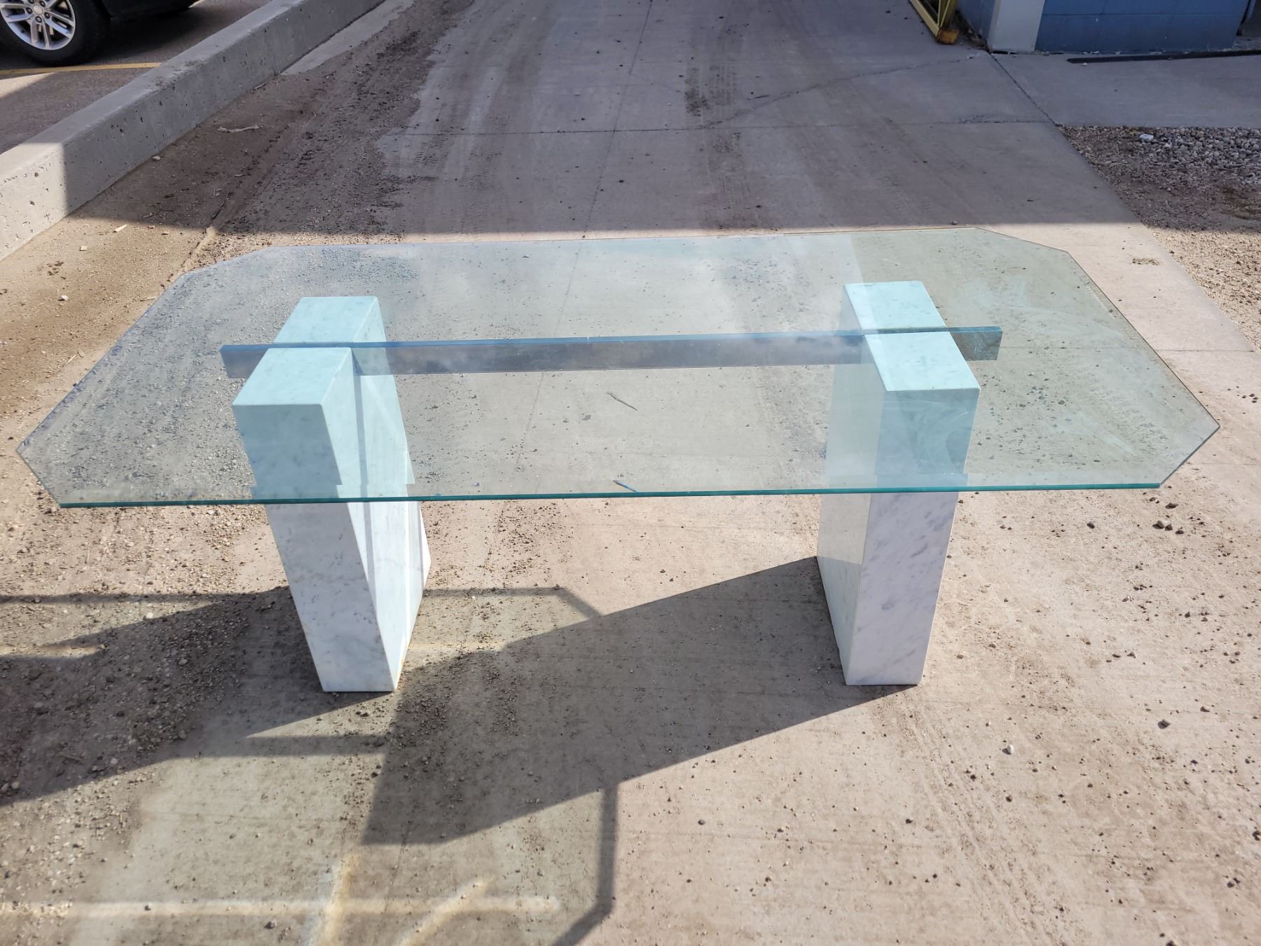 Estate Contemporary Marble Base Glass Kitchen Table. Beautiful table. Glass will need a cleaning. All 3 main components are extremely heavy. This cannot be shipped. You will need to bring help to load this item. No tools required, the metal bar just rests inside the slots. One end of the bar looks like it is missing a piece, does not compromise the utility of this table. It is quite large, the glass is approx 6 feet or more.