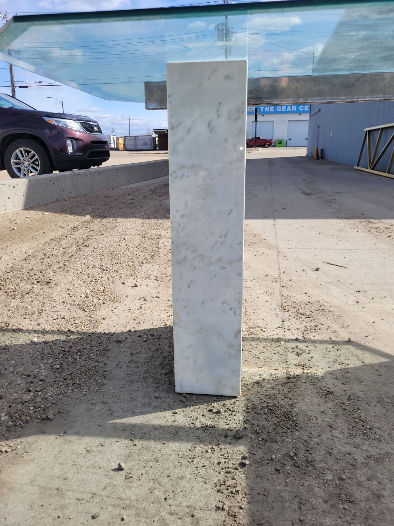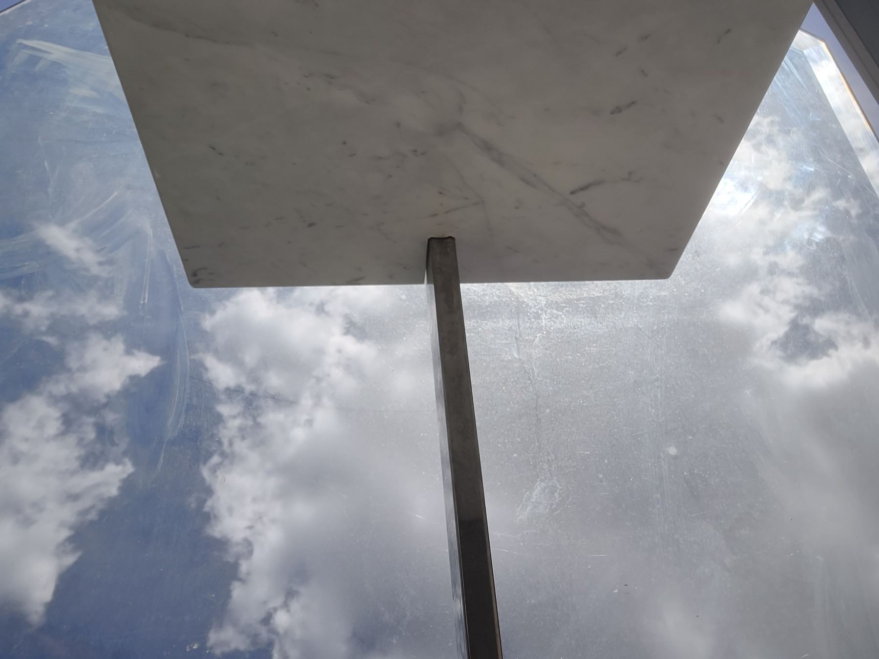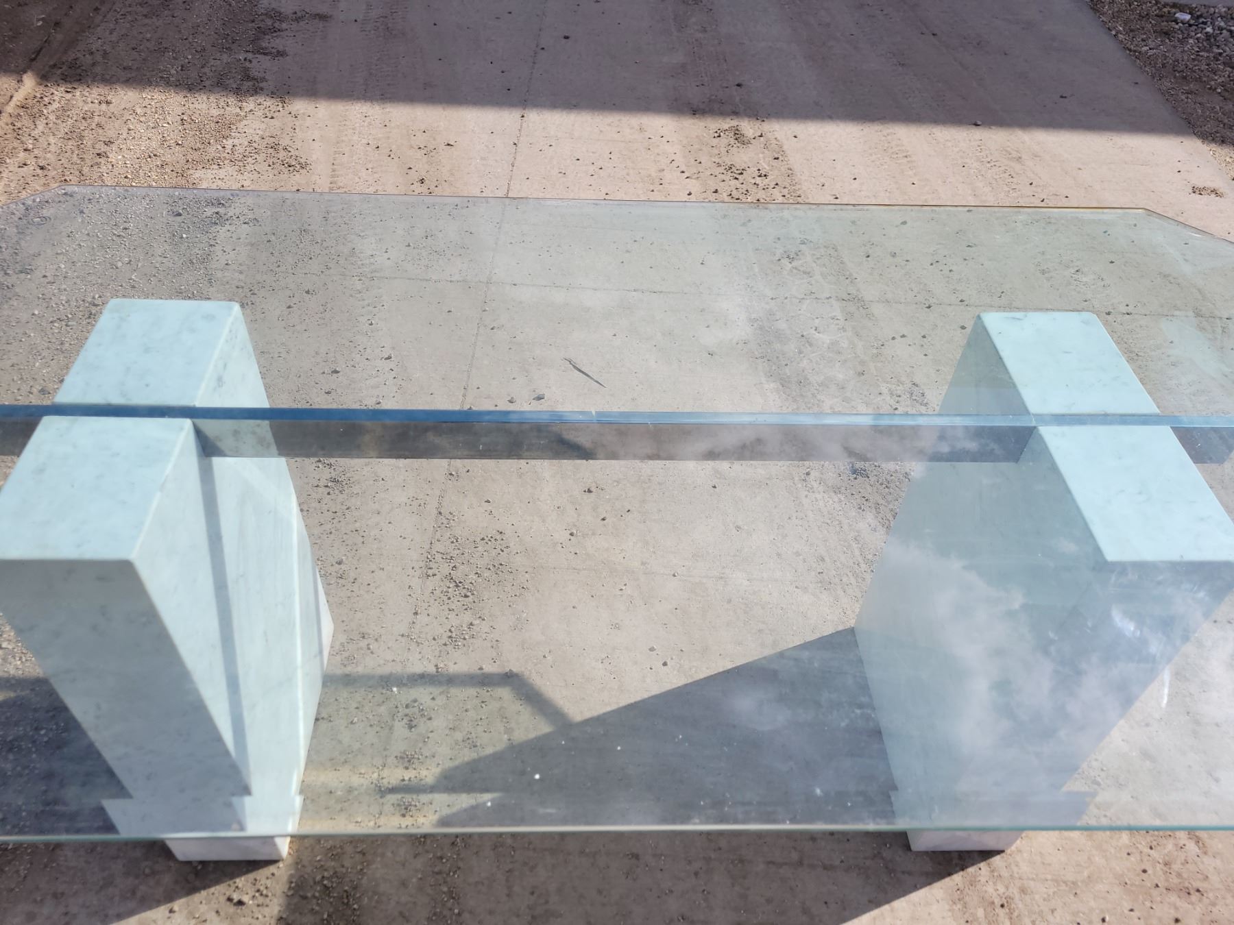 Estate Contemporary Marble Base Glass Kitchen Table. Beautiful table. Glass will need a cleaning. All 3 main components are extremely heavy. This cannot be shipped. You will need to bring help to load this item. No tools required, the metal bar just rests inside the slots. One end of the bar looks like it is missing a piece, does not compromise the utility of this table. It is quite large, the glass is approx 6 feet or more.