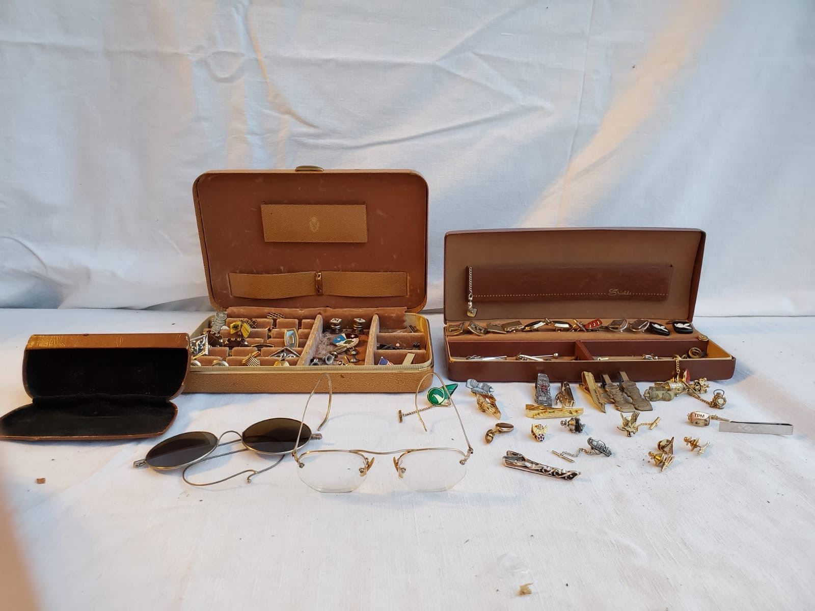 Estate mens cuff links and tie clips. Also, includes vintage reading glasses and sunglasses. As well as, a 10k gold cuff link and a sterling silver tie clip.