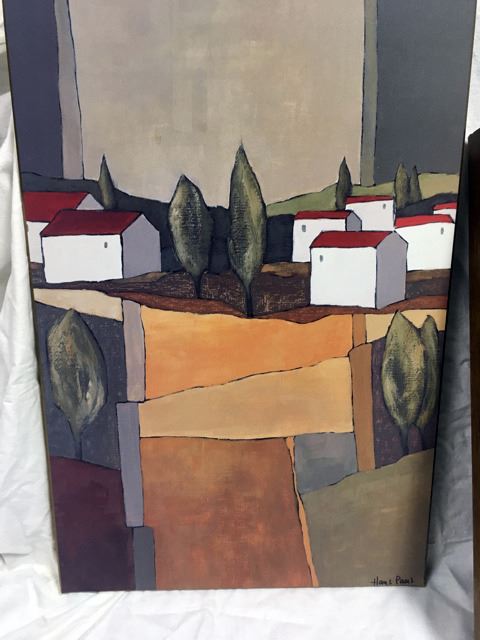 Estate decorative arwork includes framed golf print, and 3 painting prints including one by artist Stanley Grosse in very decorative frame.