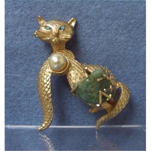 This vintage gold-tone cat brooch is a wonderful piece, circa 1950's - 1960's. The cat is holding a genuine natural piece of jade and is accented with a genuine pearl. The slanted kitten eyes are genuine turquoise. The pin weighs 16.2 grams and measures 4 X 5 cm or 2 X 1 3/4 ".