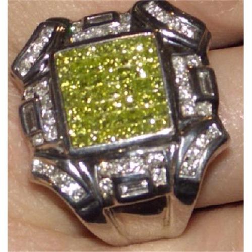 This is a stunning ring. The canary yellow diamonds are color infused natural diamonds and perfectly matched and mated with approximately 1ct of invisibly set stones. There are 40 brilliant white round diamonds and 4 emerald cut white diamonds, G-H color. The ring is set in 14ct white gold with 1.50ctw and weighs 13.8 grams. It is currently a size 9.5