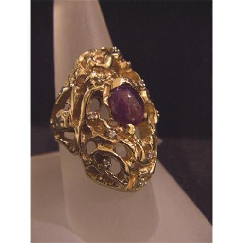 This is a fabulous ring from the 60's. It is completely handmade in 14kt yellow gold. This freestyle ring is set with diamonds and a beautiful 1.3ct cabachon ruby. Please feel free to contact me if you have any questions. thank you.