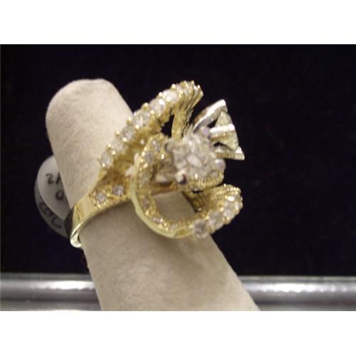 This designer estate ring is really spectacular. It is handmade in 14kt yellow gold. The two solitaire diamonds weigh 1.42cts. They are H, SI1...beautiful! The setting has 1.60cts of brilliant round white diamonds. A real eye catcher! The total carat weight of this ring is approximately 3.06ctw.