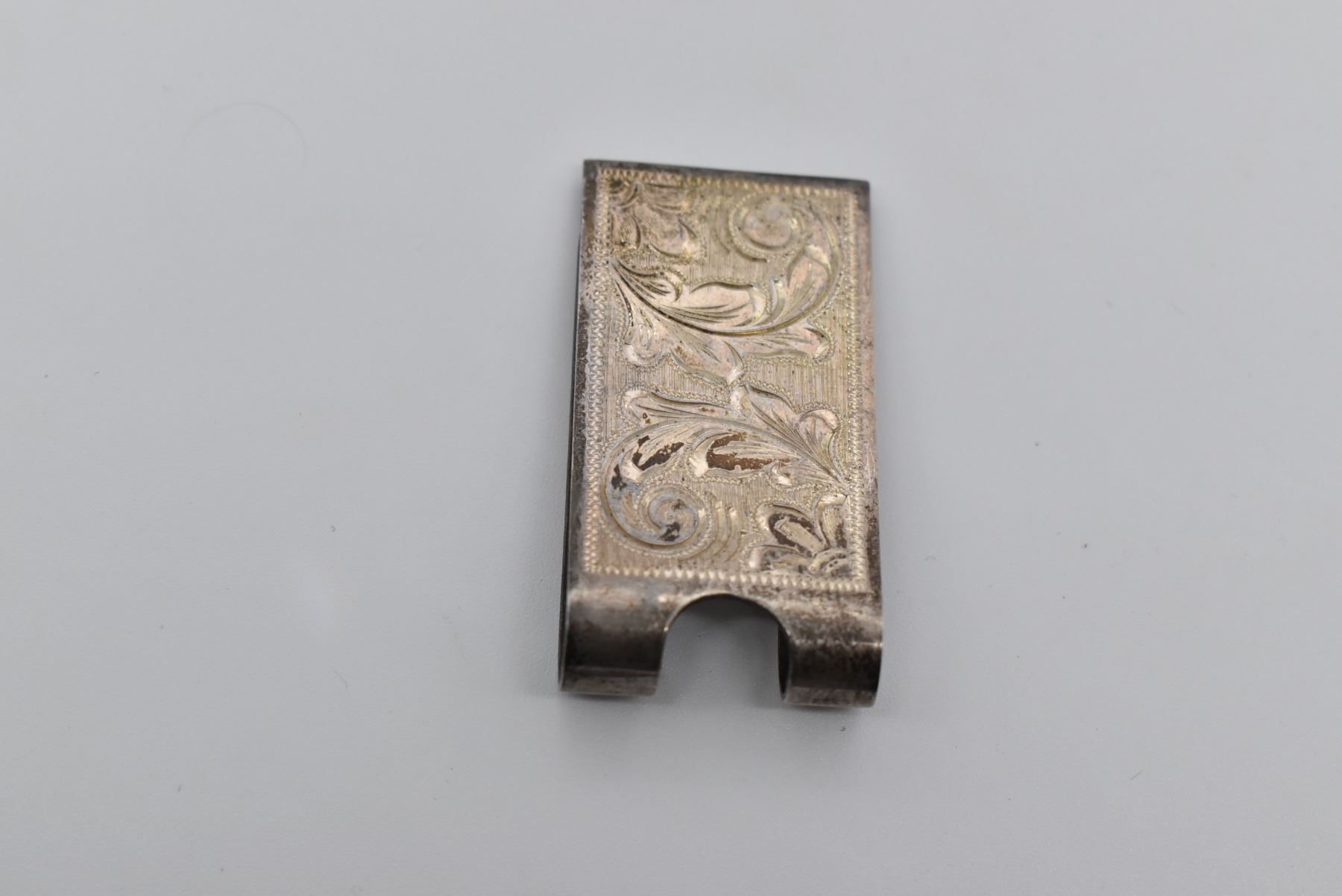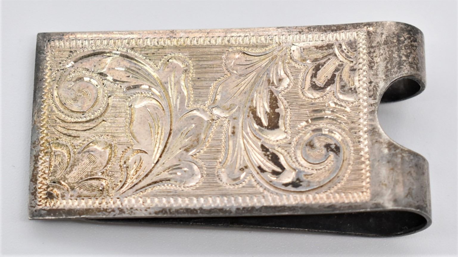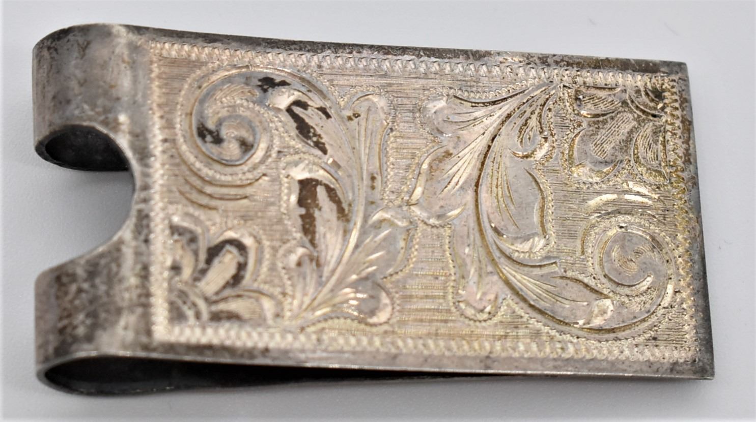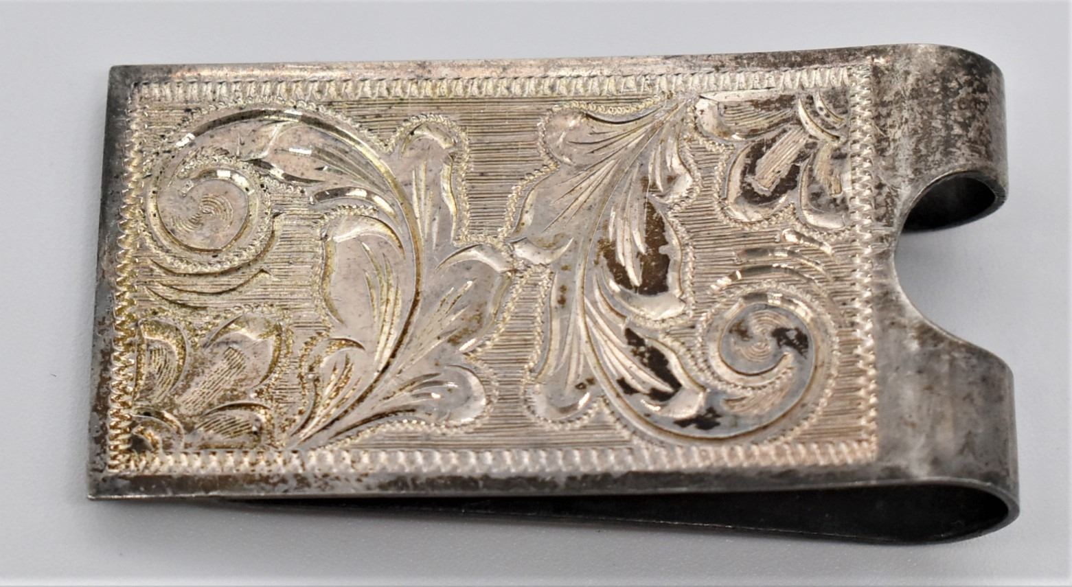 Estate Diamond Cut Sterling Silver Money Clip, measures 2''L x 1''W, marked .925 and has original Plamex Sterling foil label on the back, 17.41 grams total wt.