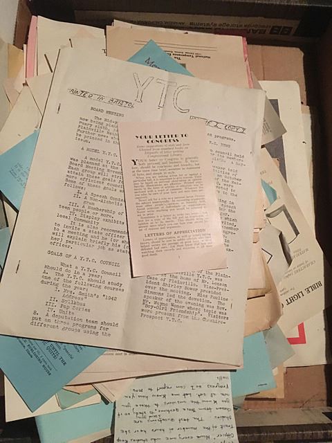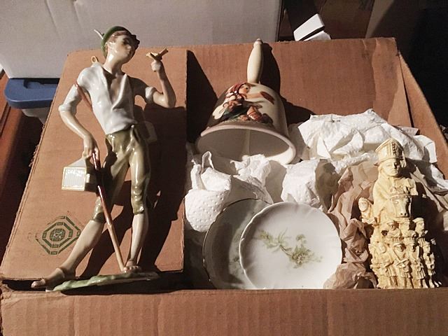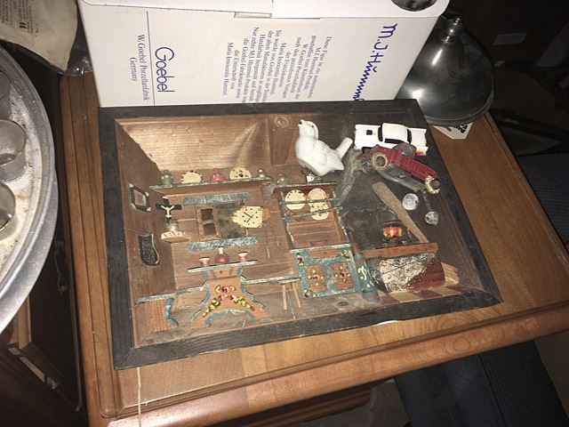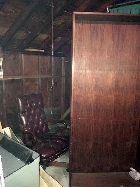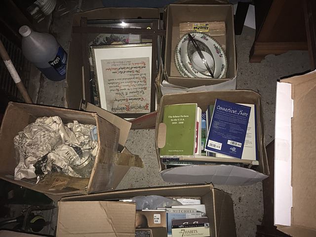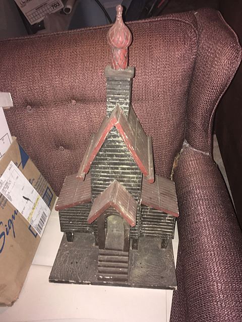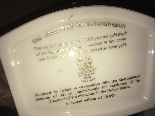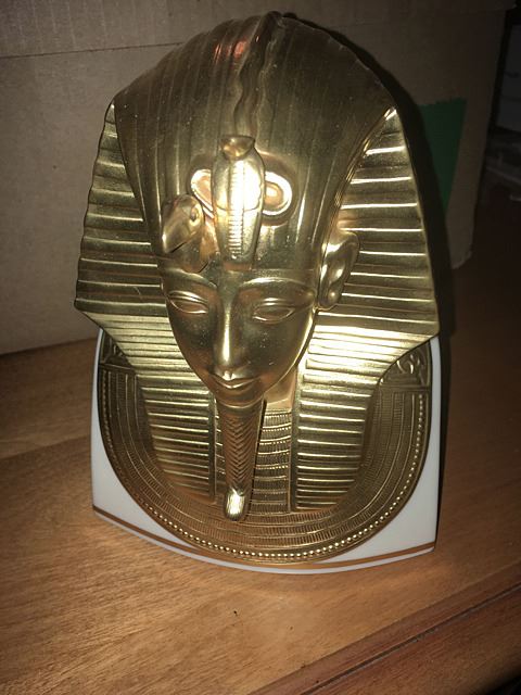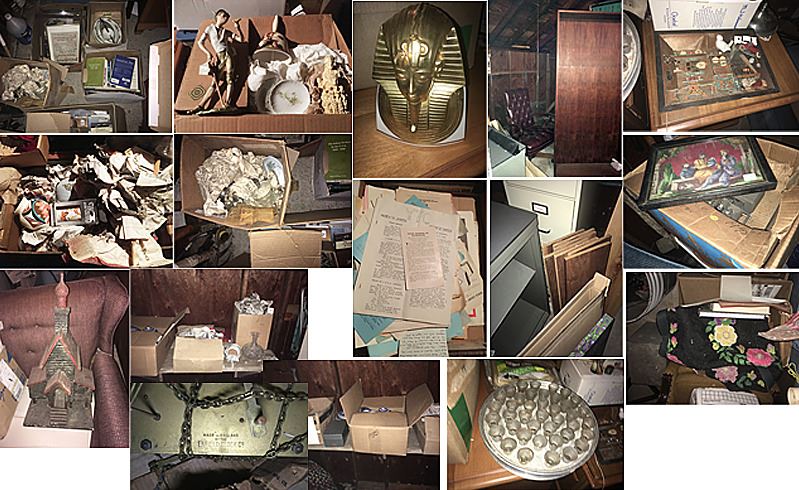Estate discovery lot includes Lenox King Tut mask with burnished 24kt gold, Stave church model, large bookcase with shelves, leather desk chair, memorabilia from the YTC Youth Church Group of Bristol, English clock works by the Enfield Clock Co. with weight, unopened boxes, and many items to be discovered, all being sold for 1 monies!
