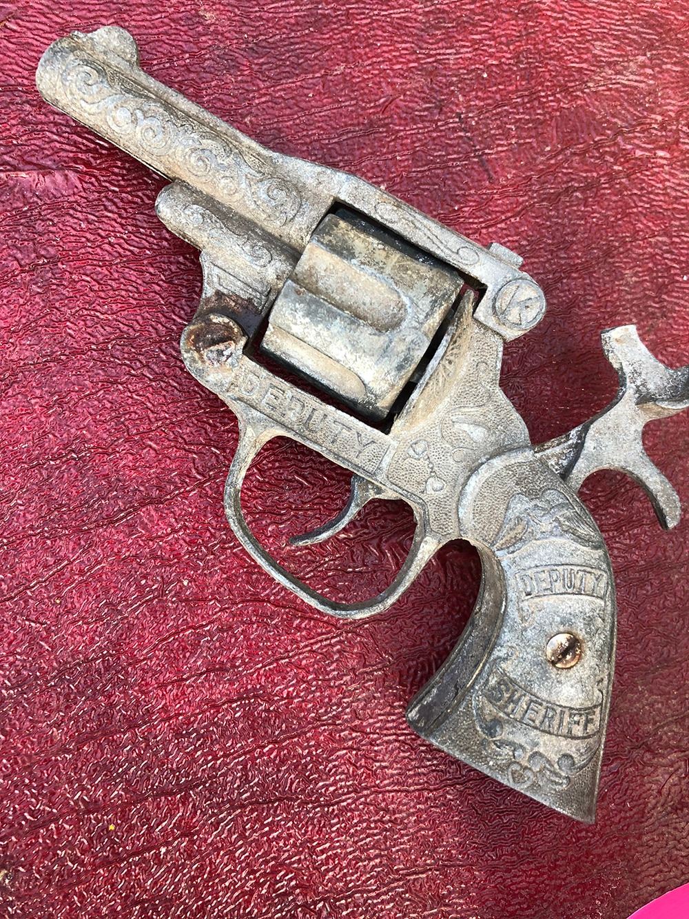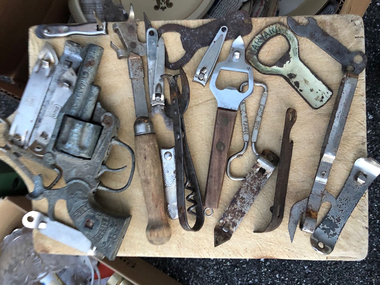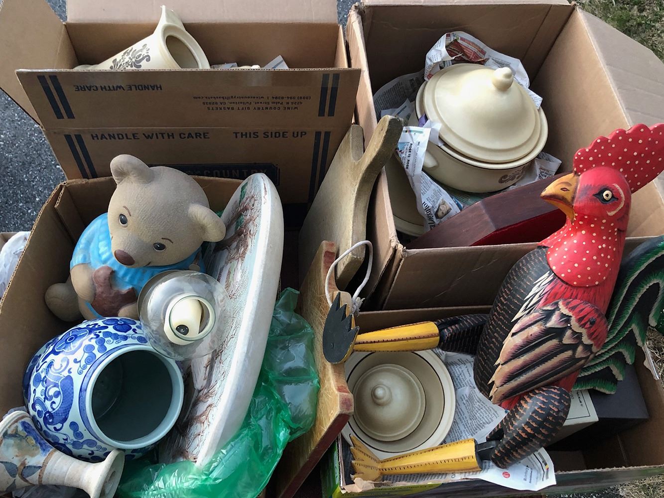 Estate discovery lot includes 8 boxes, cap gun, bottle openers, Pfaltzgraff counry dish set, wooden rooster, etc.