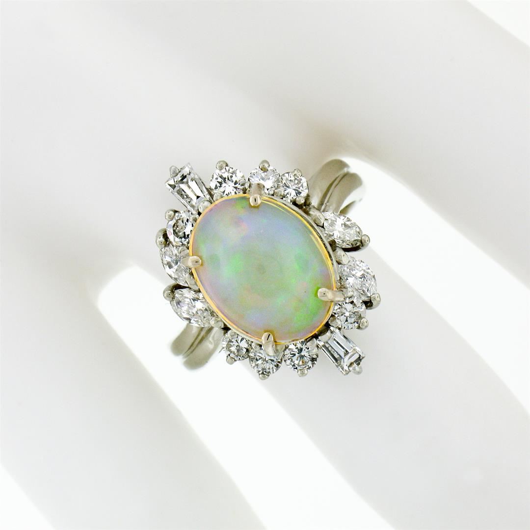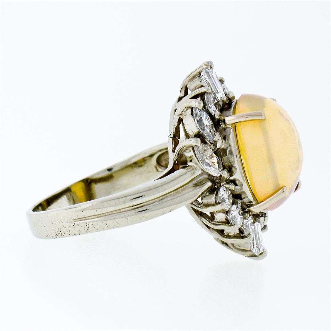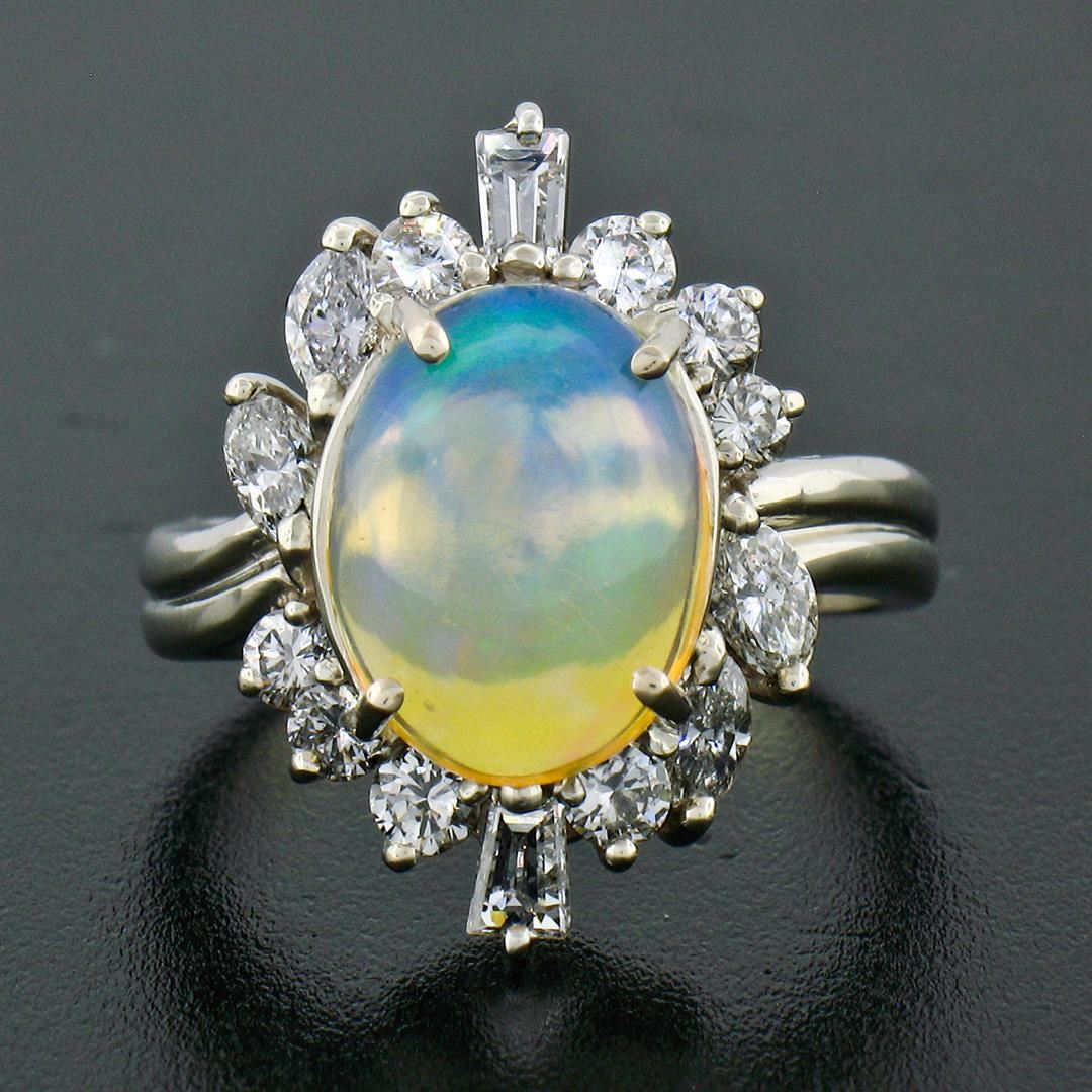 A solid 14k white gold cocktail ring, with 1 oval cabochon cut natural opal (12x9.10mm - 2.71ct), surrounded with 14 marquise, round & baguette cut natural diamonds (F/G - VVS2/VS2 ; 1.16ctw). The ring is size 9.75, weighs a total of 6.19 grams, and measu