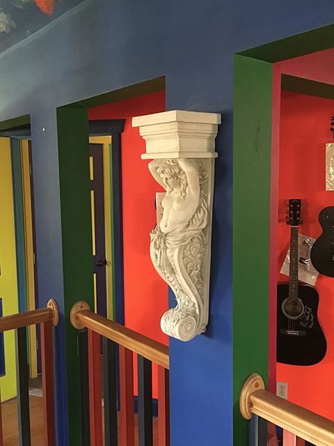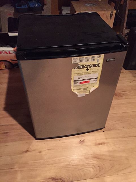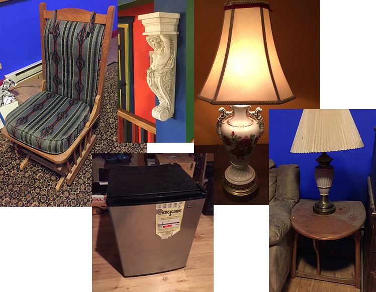 Canadian rocker, 2 table lamps, dorm-size refrigerator, end table and nice architectural wall shelf in shape of mermaid or Grecian lady. This lot can be picked up in Woodbury CT for local buyers, or our shipper can pick up and ship to your location.
