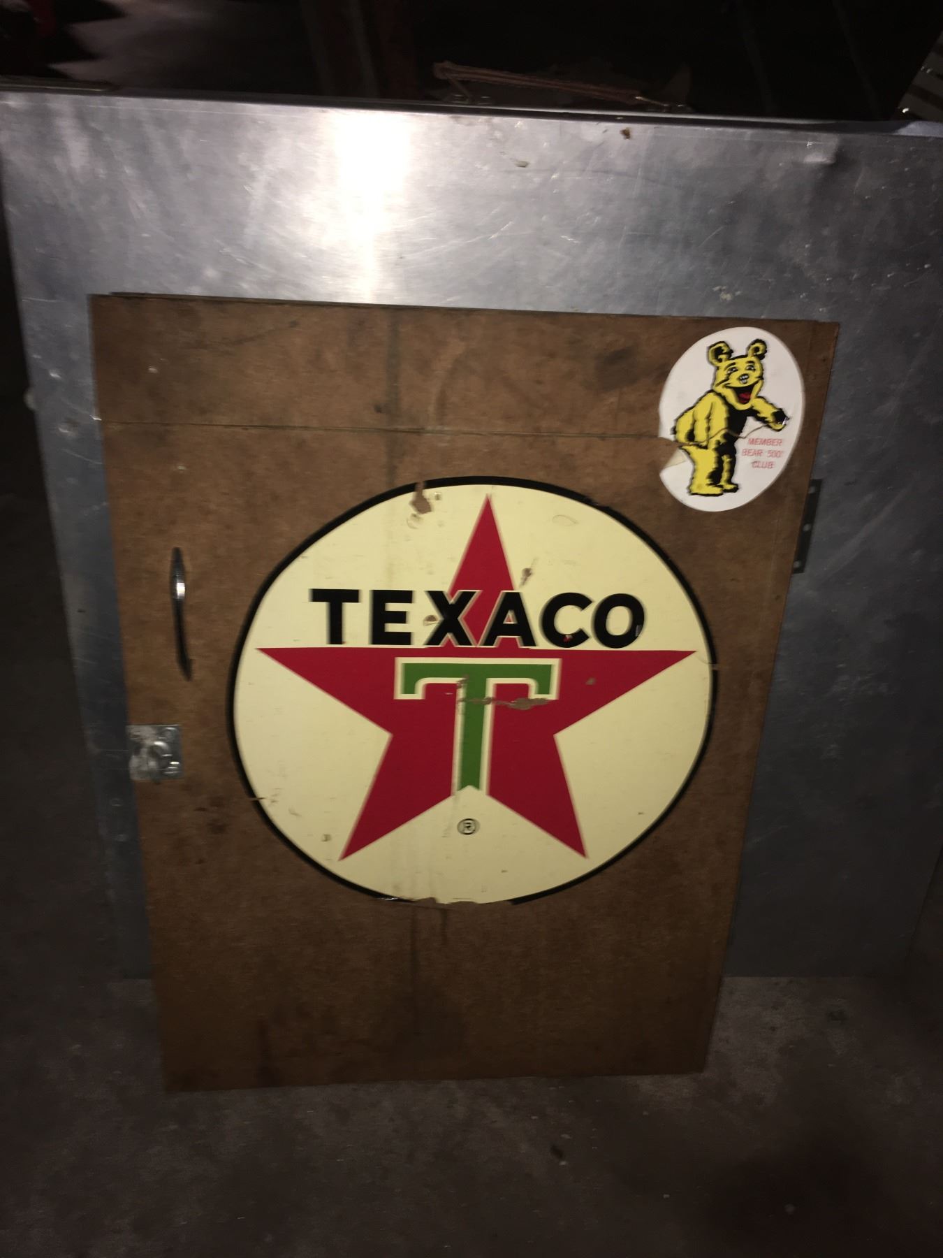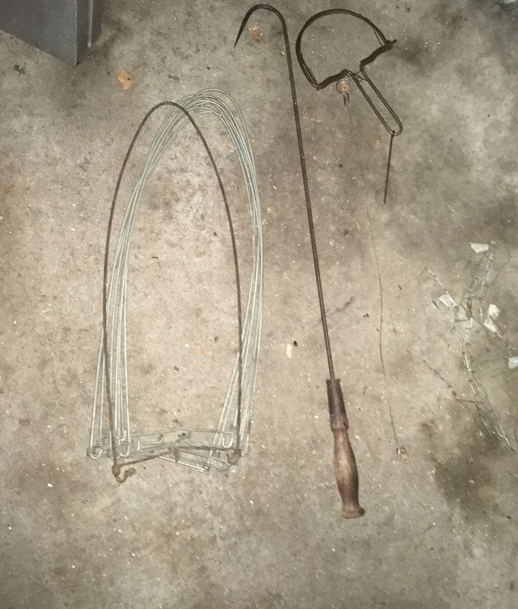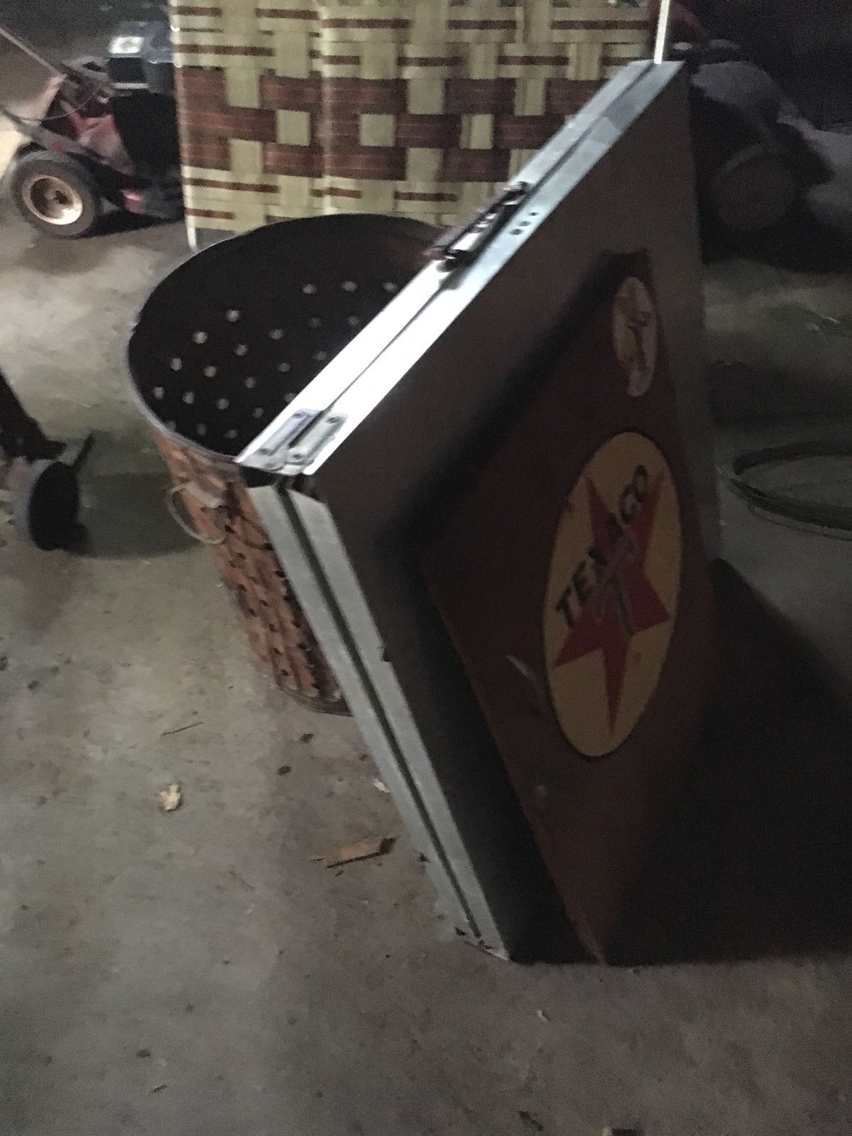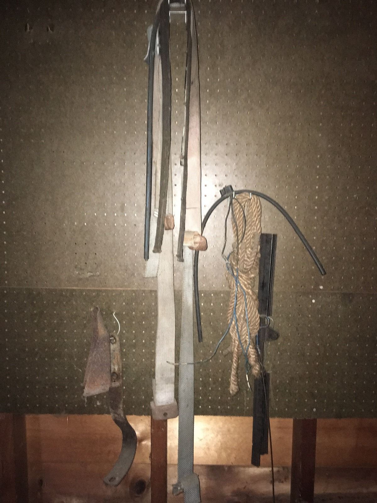 Vintage Texaco logo on wooden door (probably from tool cabinet) and fish well, plus folding aluminum table. Hider stretchers, hook, snare trap, fish stringer, cage trap, metal tool box, items on gargage pegboard incouding leather straps and rope. All being sold as found at the estate. (RL)