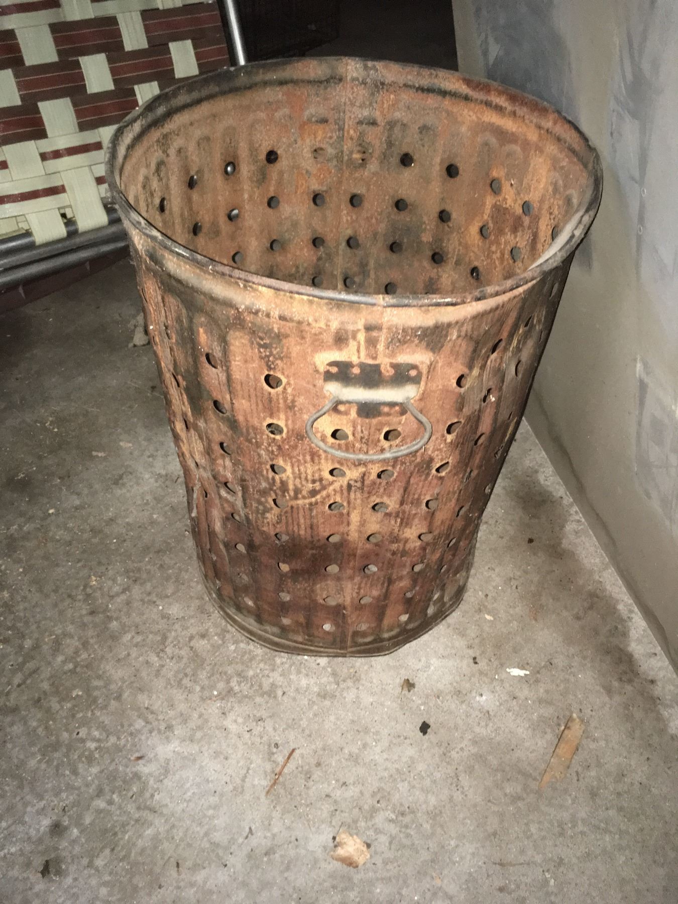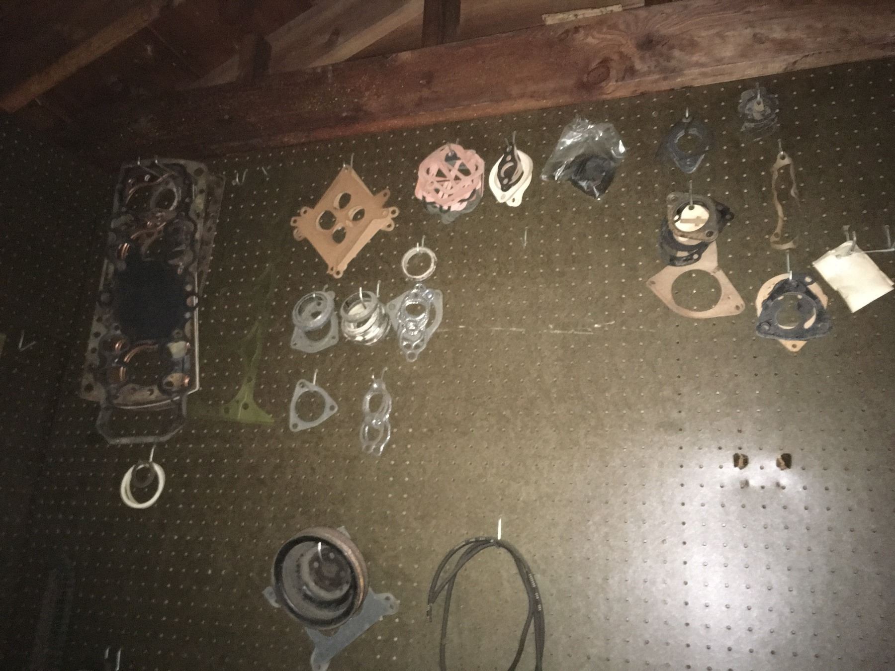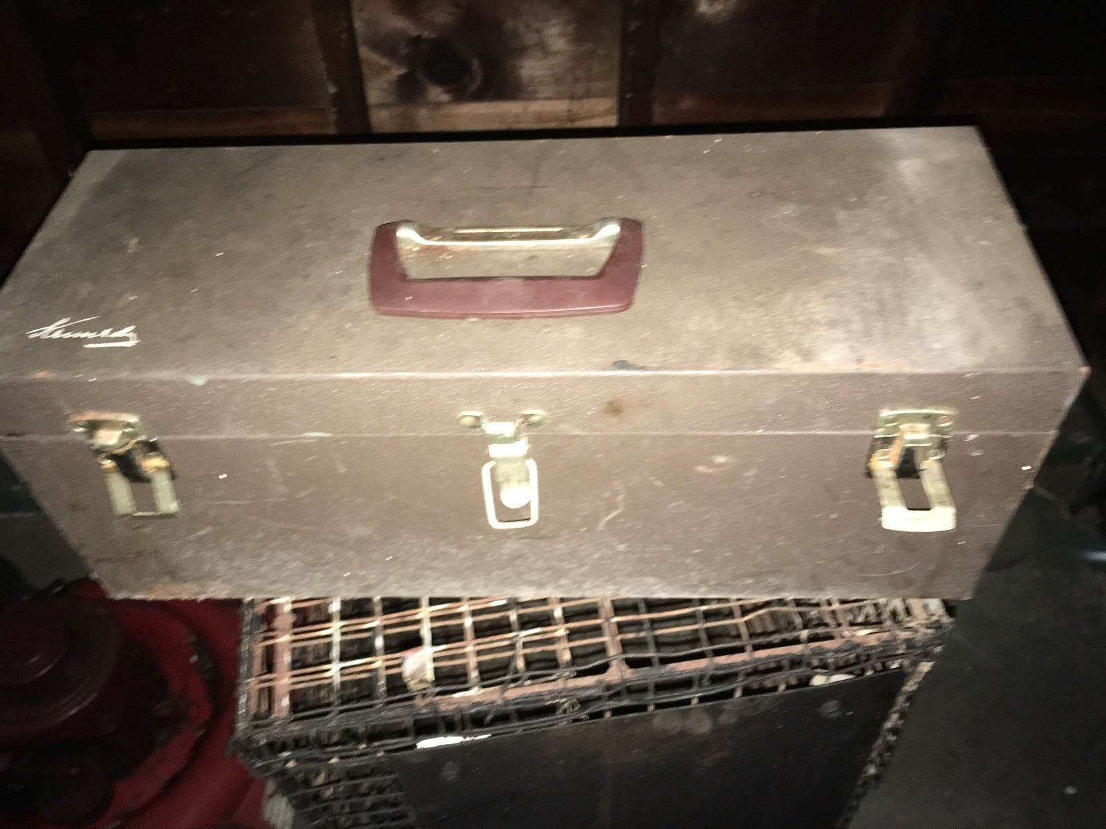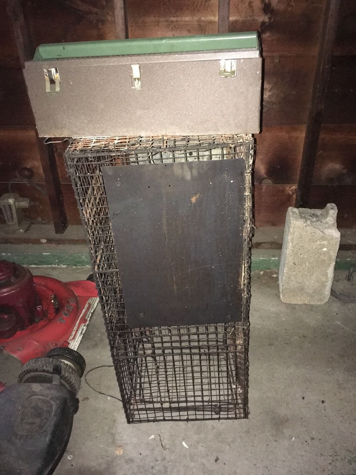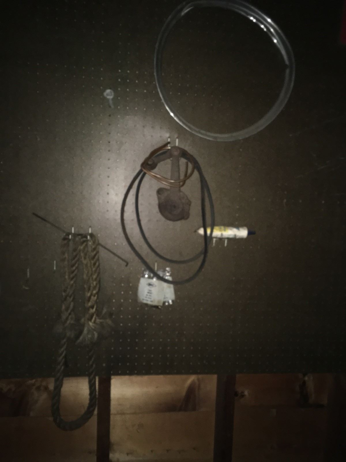 Vintage Texaco logo on wooden door (probably from tool cabinet) and fish well, plus folding aluminum table. Hider stretchers, hook, snare trap, fish stringer, cage trap, metal tool box, items on gargage pegboard incouding leather straps and rope. All being sold as found at the estate. (RL)