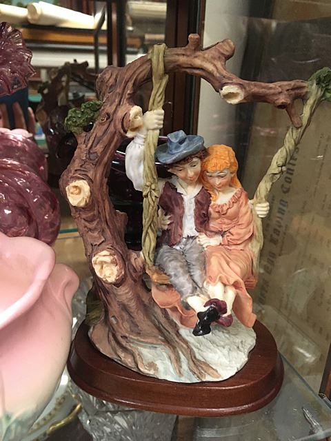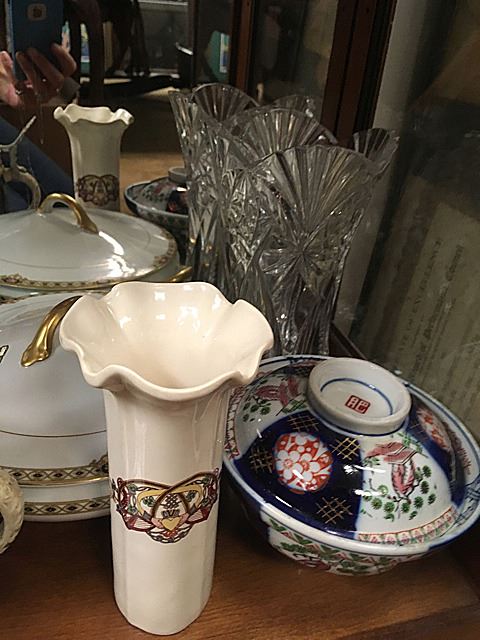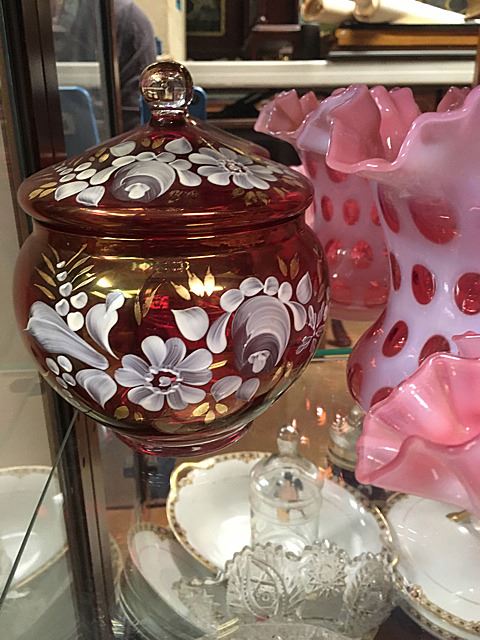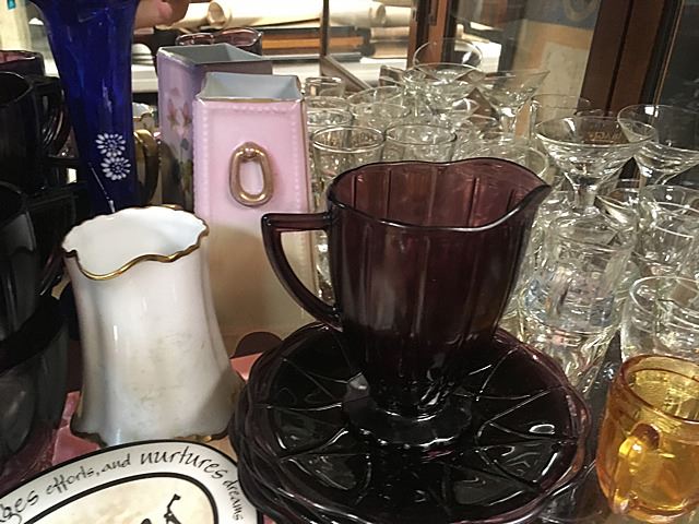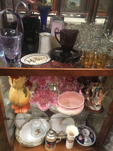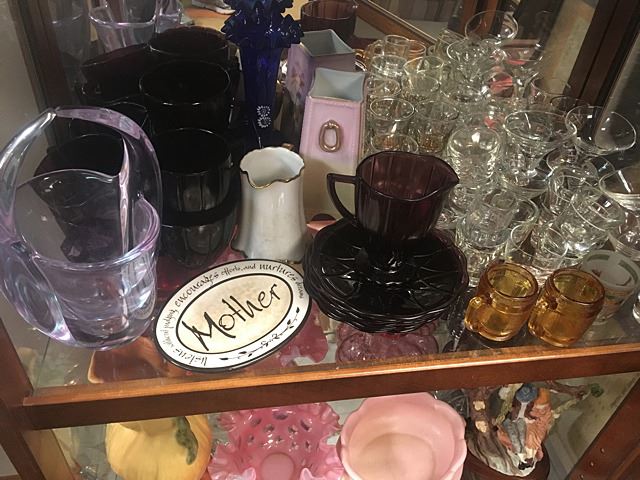 Estate glass, China and pottery lot includes nice Hull Pottery bowl, Weller Pottery Vase, Fenton Hobnail cranberry opalescent vase and bowl, cranberry glass painted covered jar, purple glass pitcher, plates and cups, lilac handled vase, amber glass, crystal, figurine, cranberry glass pitcher, China, covered stein, etc.