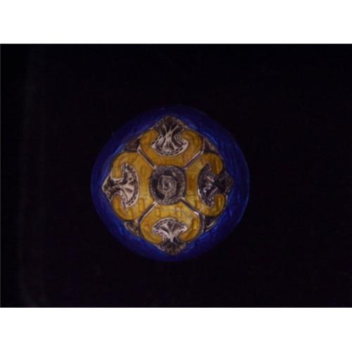 This is a beautiful estate enamel ring. The sterling silver hallmarked ring is one of a kind, handmade. There is intricate hand engraving on the top and on the sides of the ring with blue and yellow hand enamel. The ring is currently a size 7.5 and weighs 4.9 grams. The blue ring pictured in photo three is available in a seperate auction.