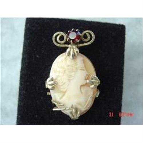 <tr><td>Title:Estate Hand Carved Cameo Brooch Red Rhinestone</td></tr>