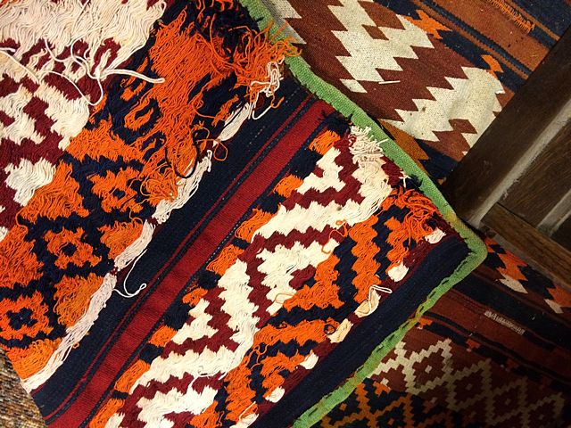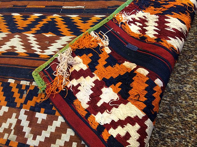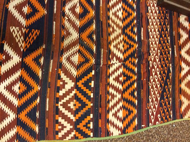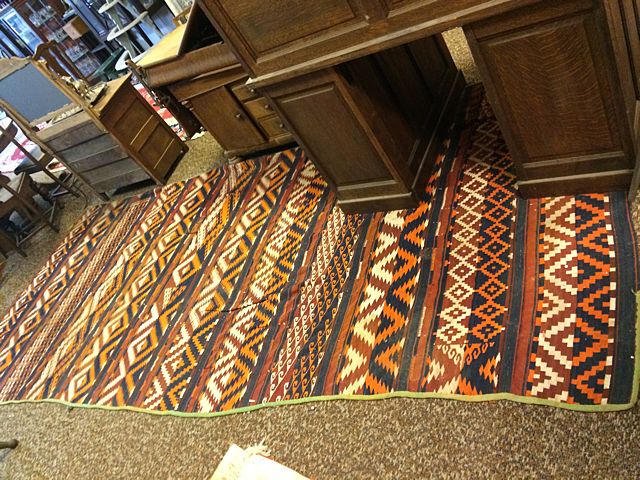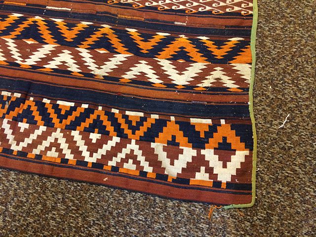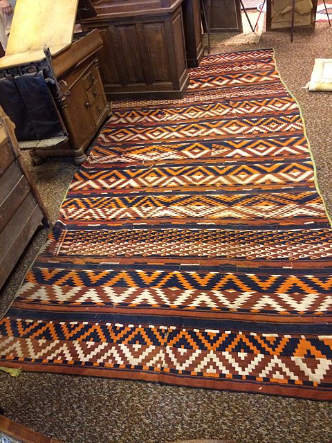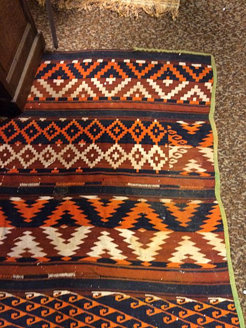Estate Hand Woven Kilim Rug with very nice geometric design. Very large, measures 67" wide x 156" (13 feet) long. This item may be picked up in Torrington, CT. Appointment time will be scheduled after auction date.