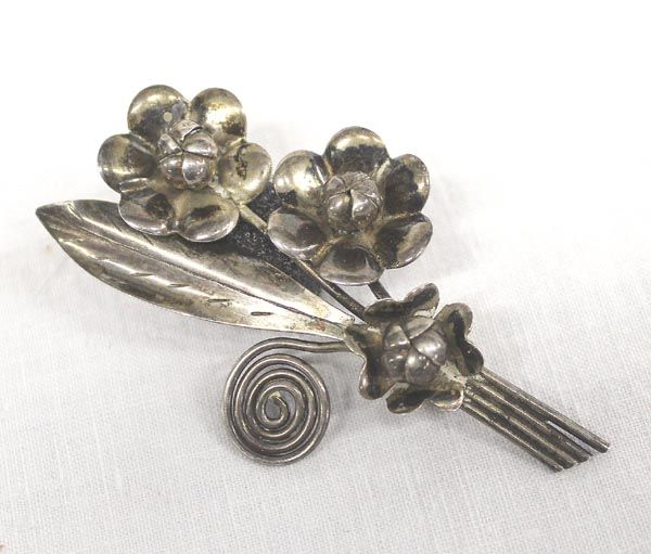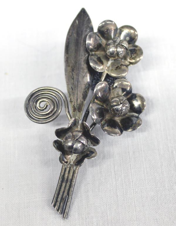Estate Hand Made Sterling Silver Flower Pin, measures approx. 2 3/4''Lx 1 5/8''W. Marked on the back of the pin under the clasp, Handmade Sterling.