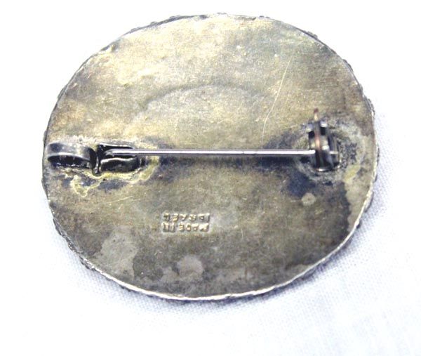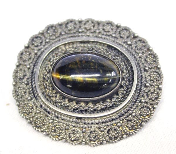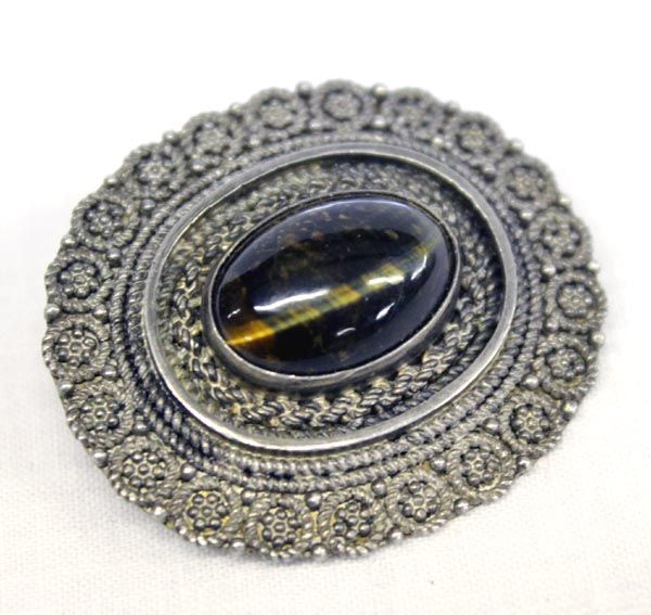 Estate Israli Sterling Silver Catseye Pin, measures approx. 1.5'' x 1.5''. Catseye Cabochon measures 1x.5''.
