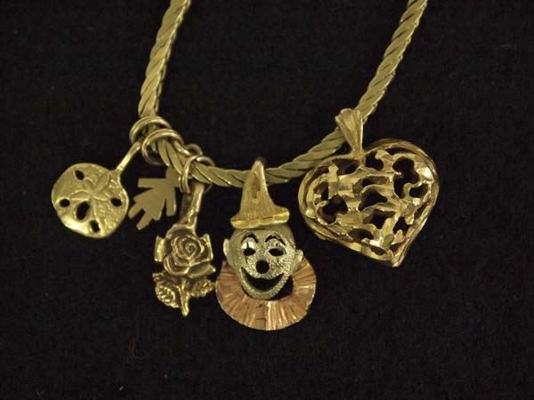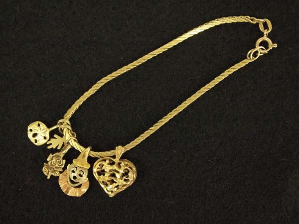 Lovely Italian 14Kt Gold Charm Bracelet from the Posey Estate, measures 7'' end to end and largest charm (Heart) measures .5''W x 5/8''L, bracelet is marked 14K Italy, and all charms are stamped 14K, 8.73g in total wt.