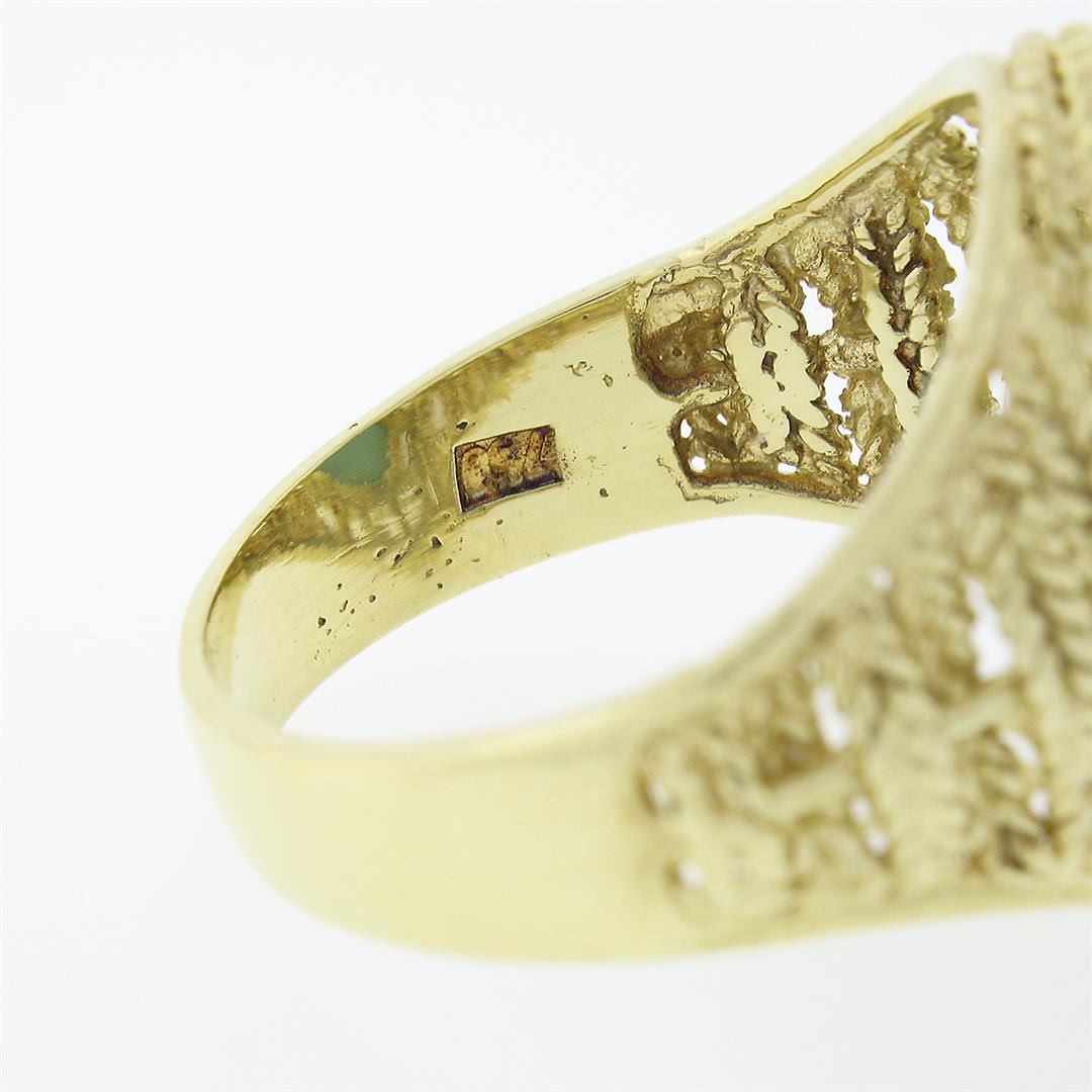 A solid 18k yellow gold italian solitaire braided cigar ring, with 1 elongated oval cabochon cut natural turquoise (14.6x7mm). The ring is size 7.5, weighs a total of 7.48 grams, and measures 17.95mm wide.