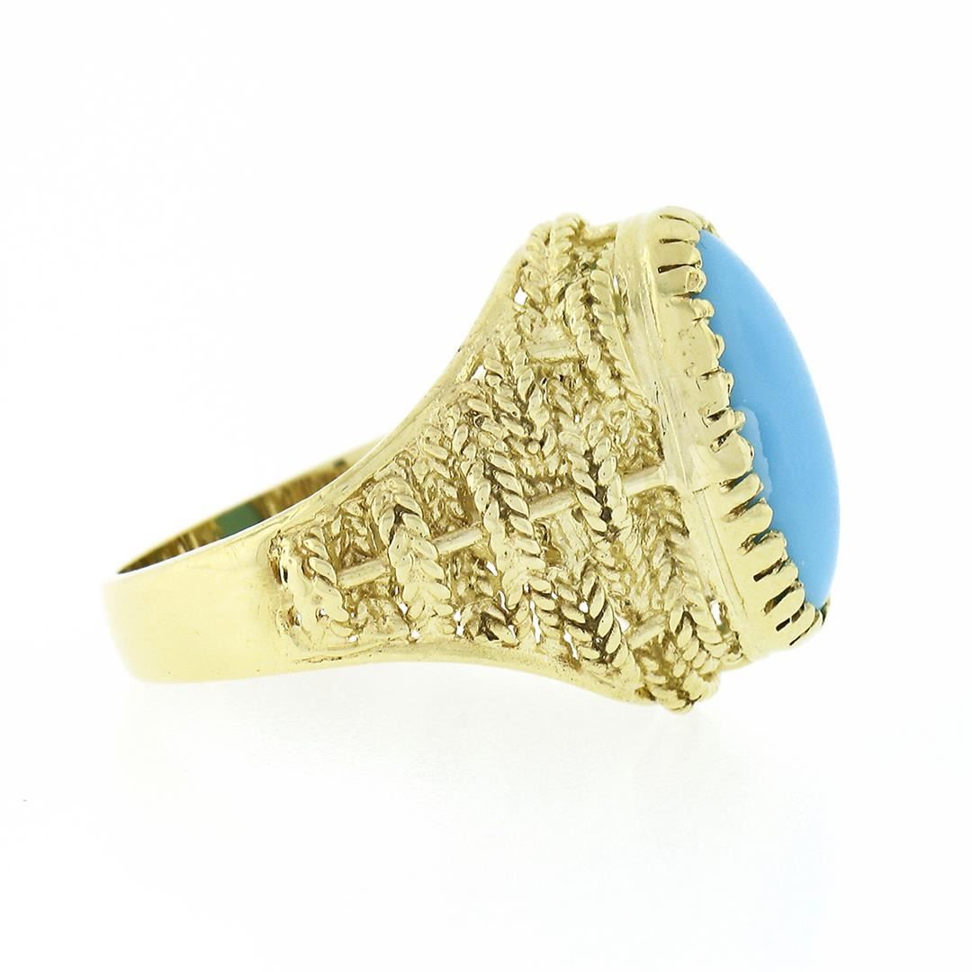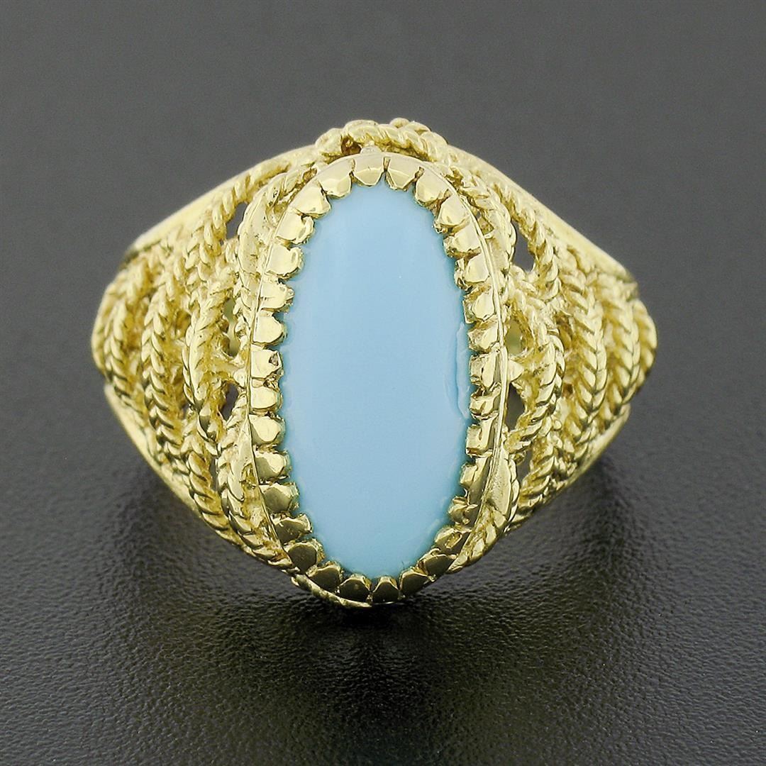A solid 18k yellow gold italian solitaire braided cigar ring, with 1 elongated oval cabochon cut natural turquoise (14.6x7mm). The ring is size 7.5, weighs a total of 7.48 grams, and measures 17.95mm wide.