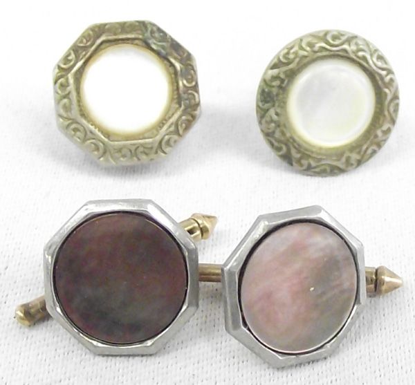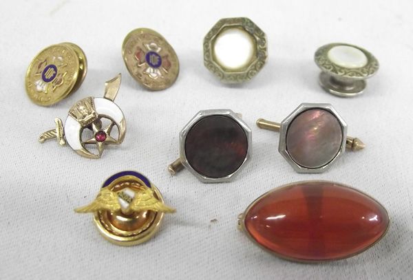 Estate Jewelry Collection and Fraternal Pins. The vintage items include: a pair of sterling & 14k gold cufflinks; 2 Mother of Pearl and sterling pins with push backs (tie tacks or ?); a 10K gold pin with an amber colored oval stone which measures 1''L x 3/8''W; 4 fraternal pins for a pilot's association (AOPA), two for odd fellows (IOF), and one Mason.