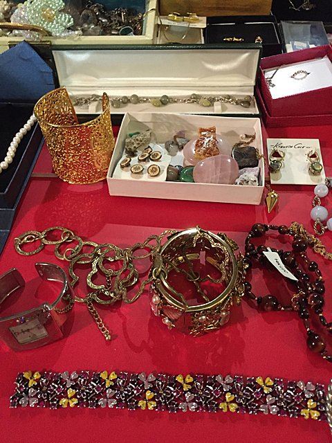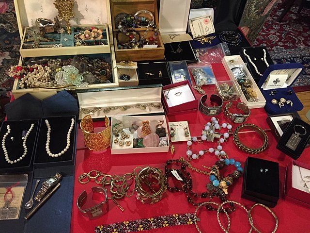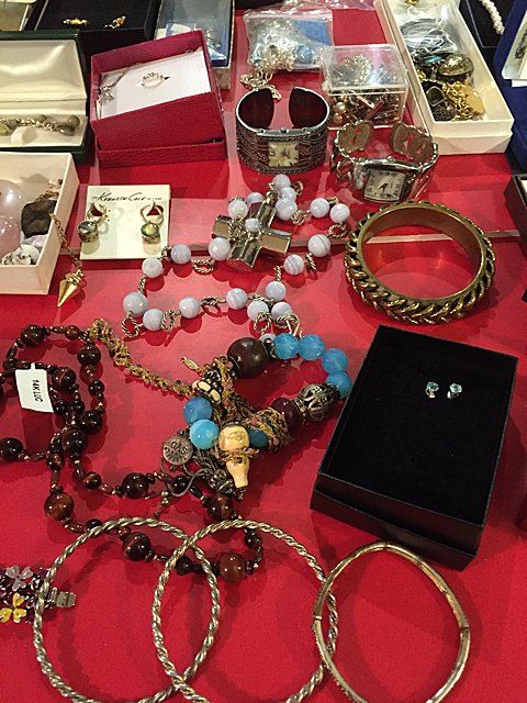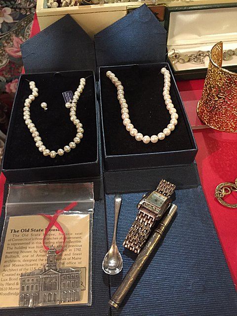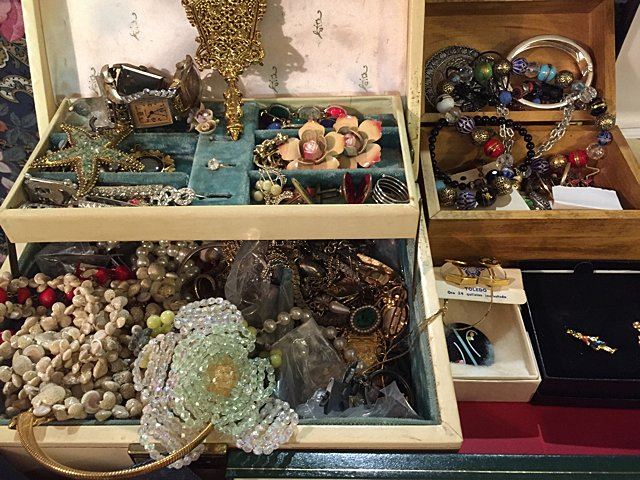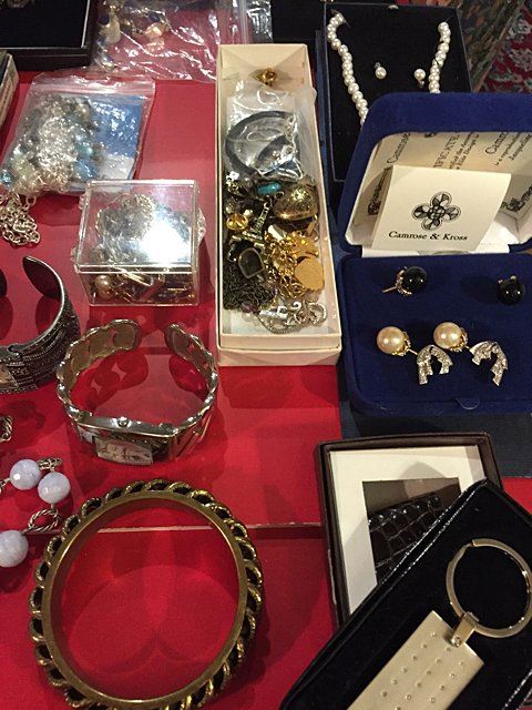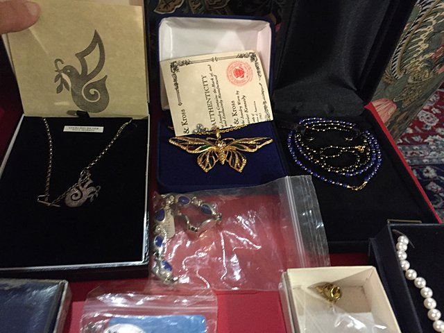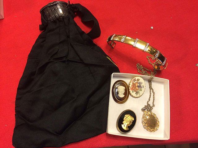 Large Estate jewelry lot includes; beaded necklace with blue 18kt gold, sterling silver watches, necklaces, bracelets, earrings, pins, vintage ladies purses, stick pins with 1 marked 14kt gold a couple appear to be gold, Elephant could be political memorabilia in vintage match box, cameos, a very nice estate lot.