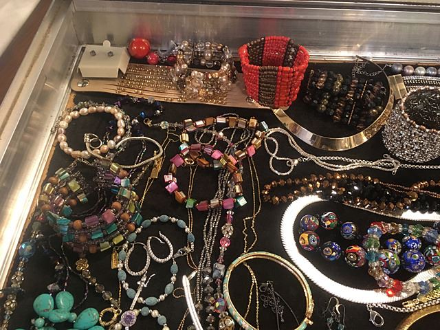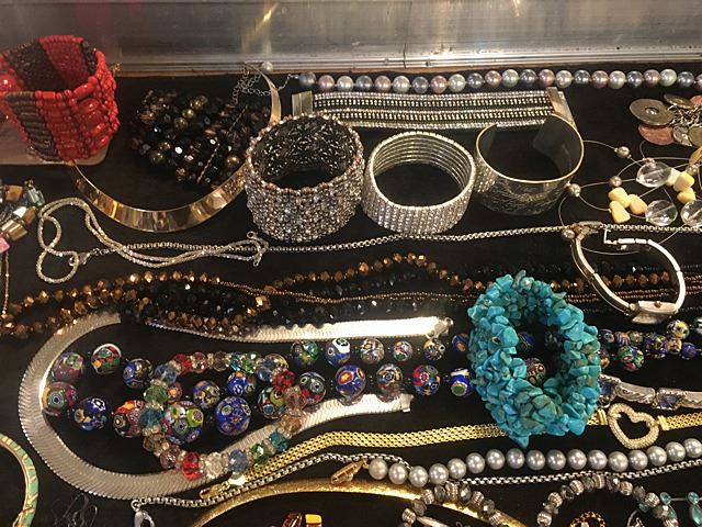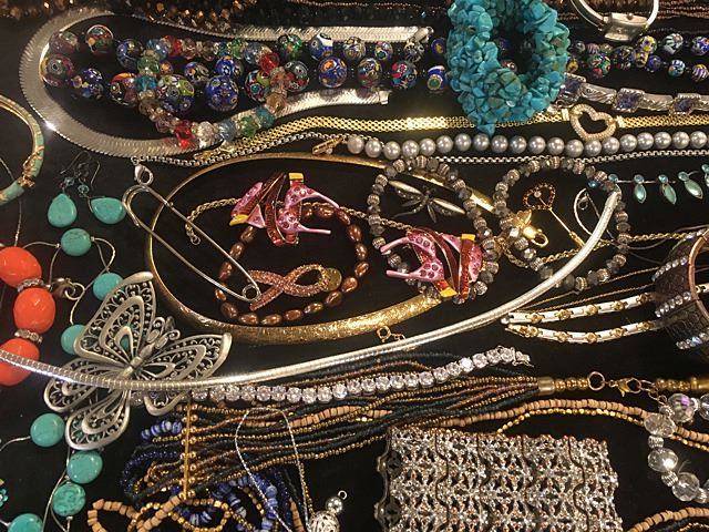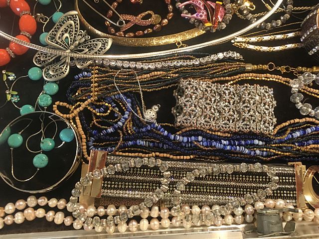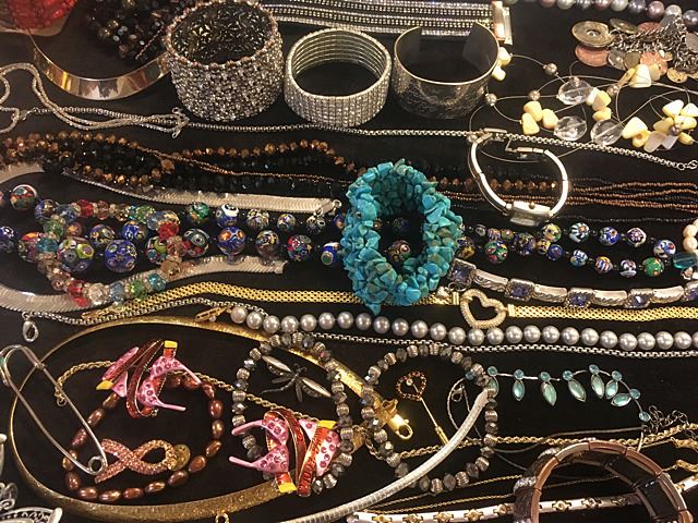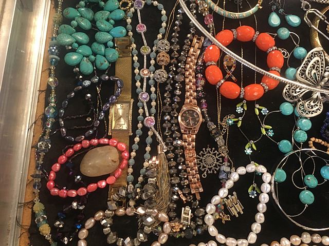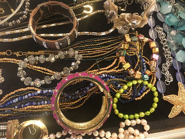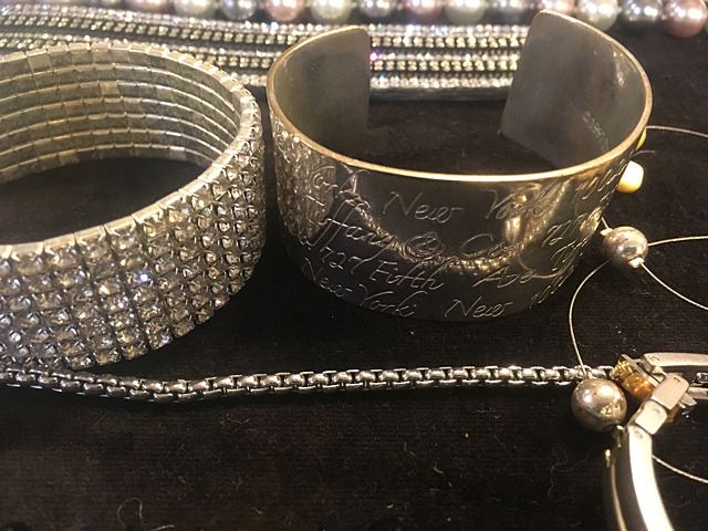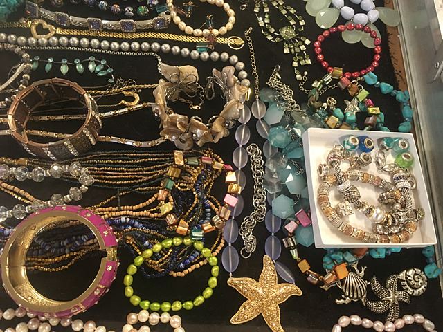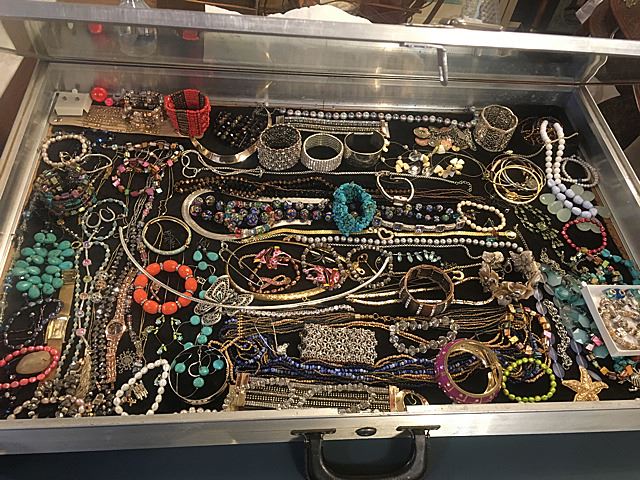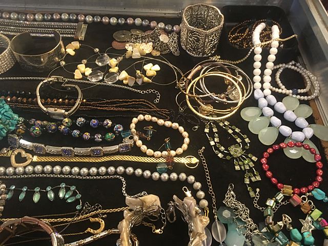 Exceptional lot of estate jewelry includes sterling silver Tiffany & Co. engraved cuff bracelet, many high style pieces, cuff bracelets, sterling silver galore including necklaces, beads, turquoise and other semi-precious stones, Pandora style beads, gold mesh scarf/necklace, etc. All being sold just the way we found it at the estate for 1 monies!