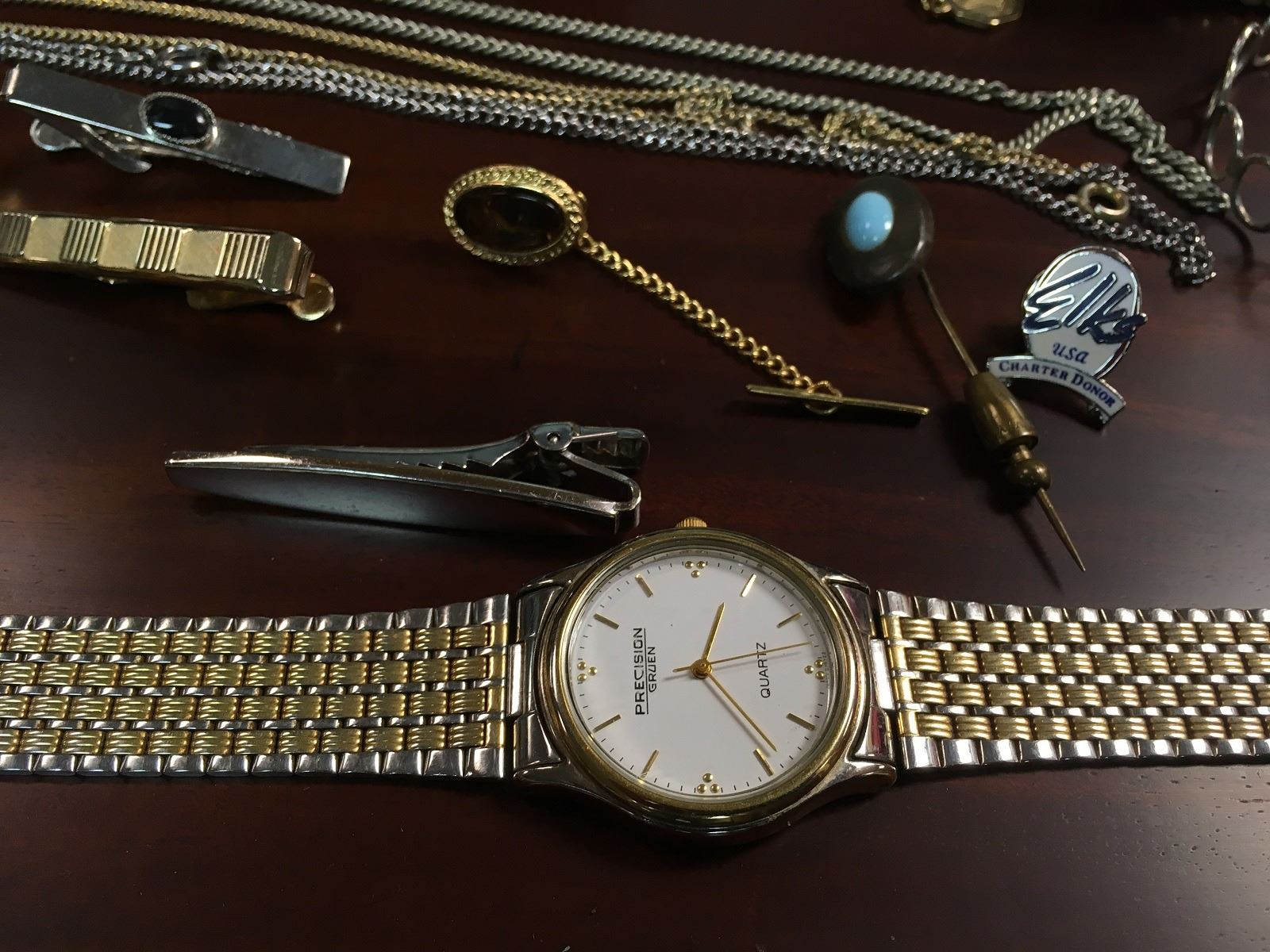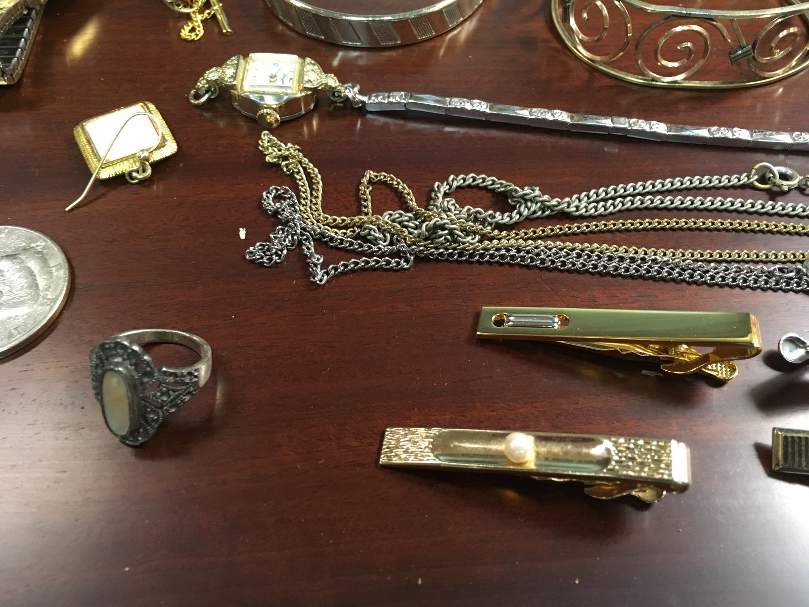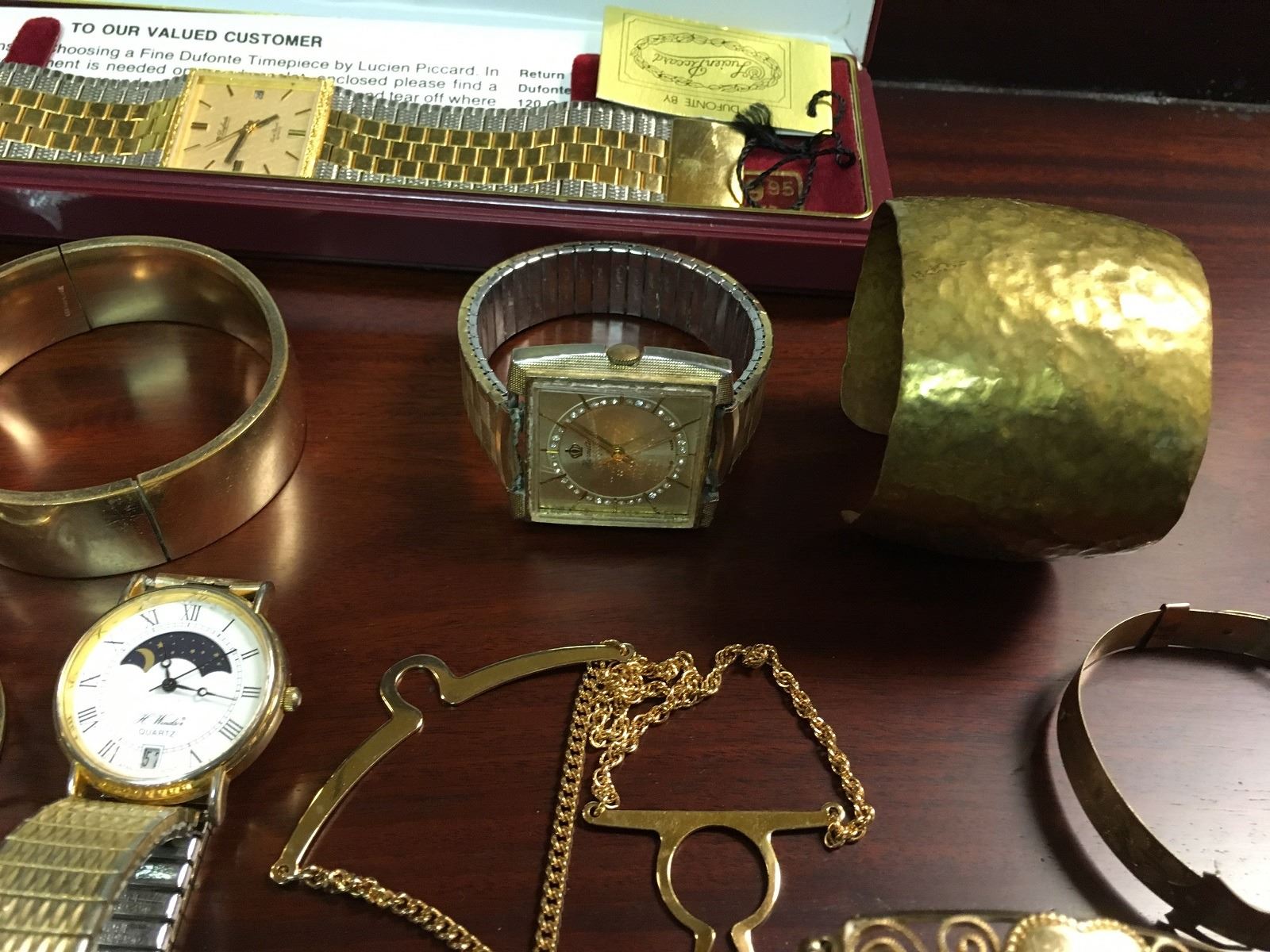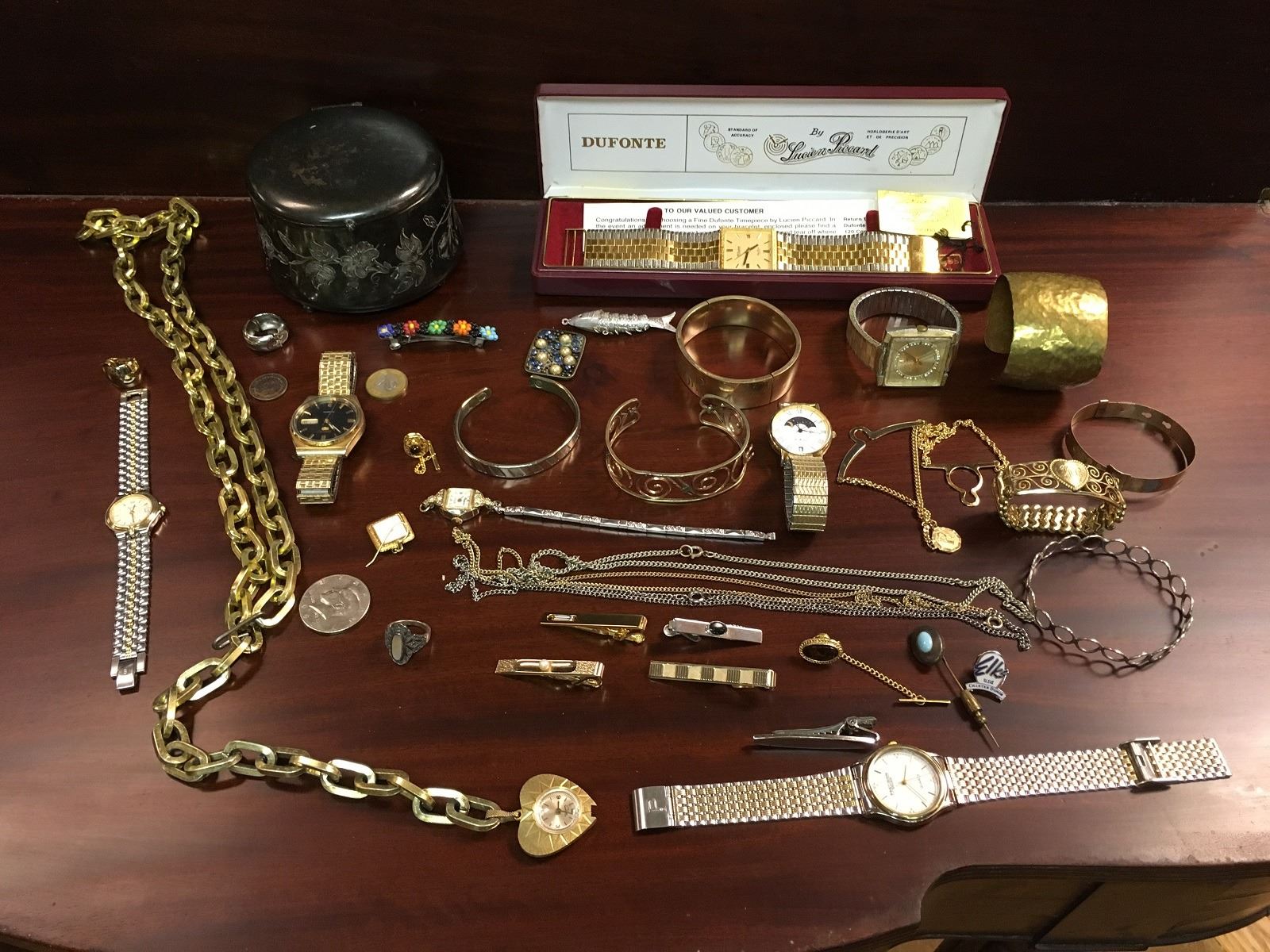 Estate jewelry lot includes watches, cuff bracelets, necklaces, tie clips, Dufonte by Lucian Piccard Watch, Bulova Watch, jewelry box, ring, stick pins, etc.