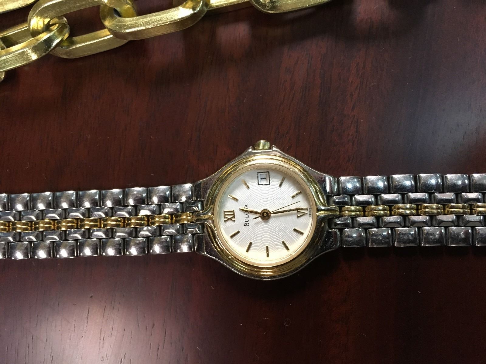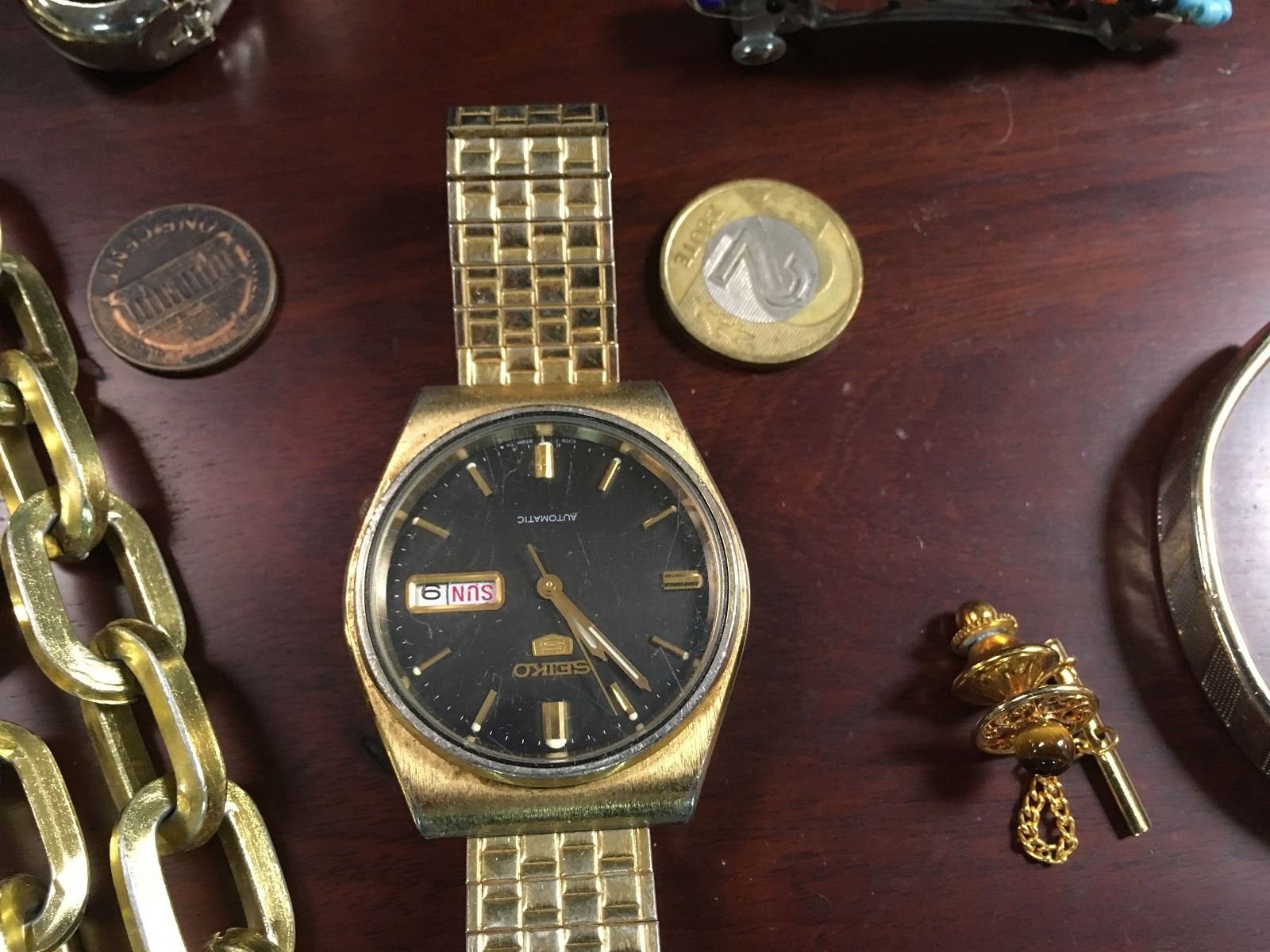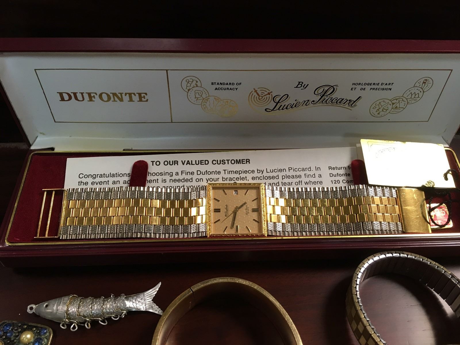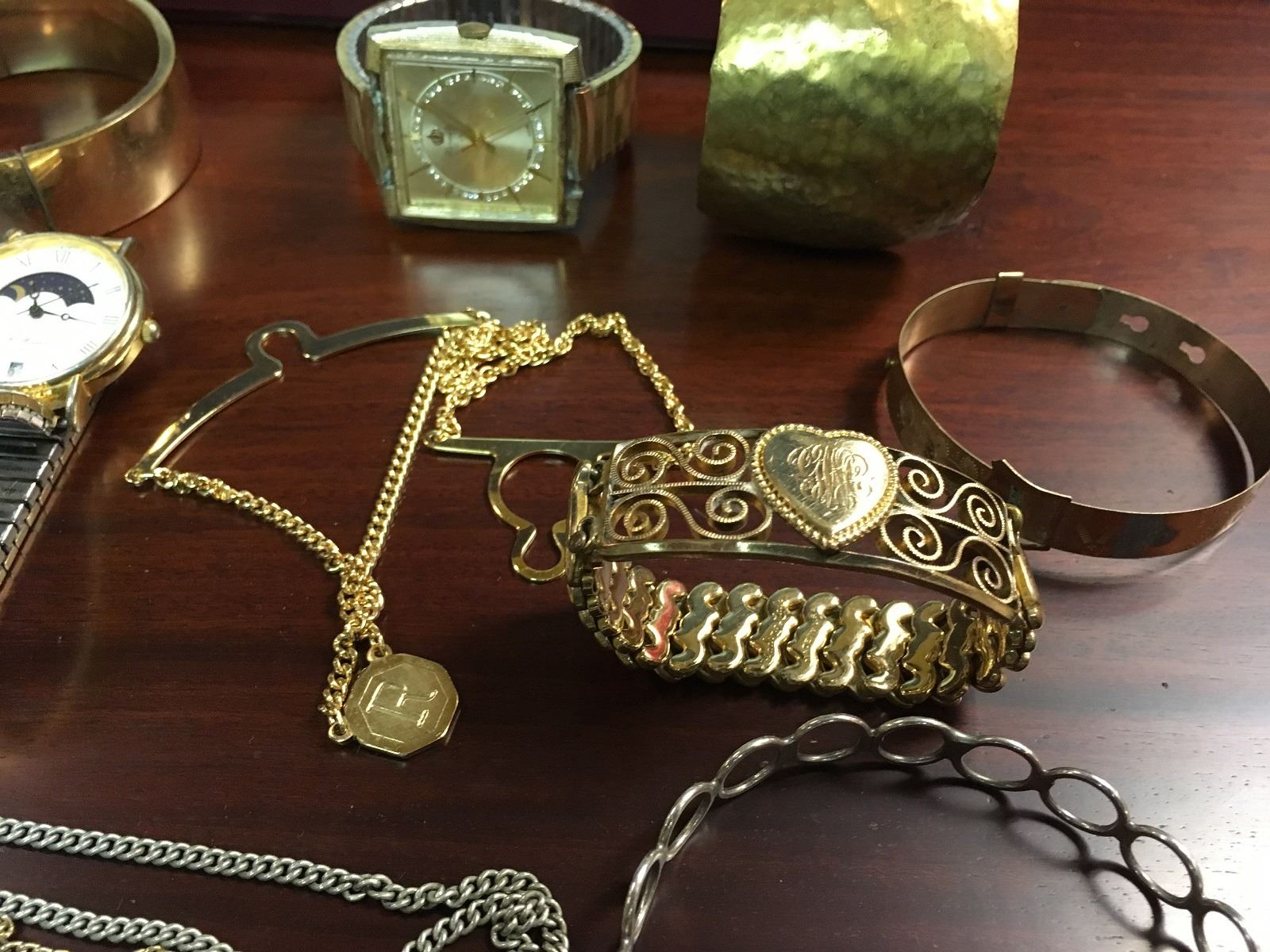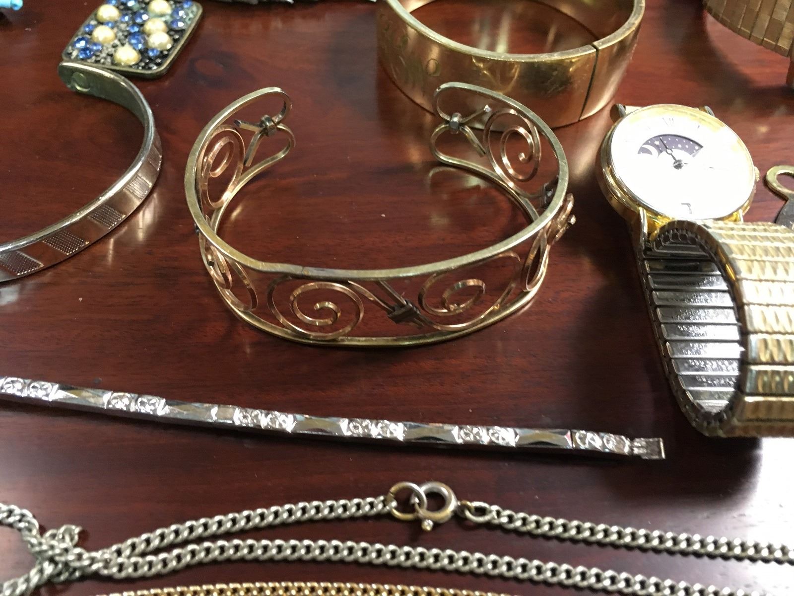 Estate jewelry lot includes watches, cuff bracelets, necklaces, tie clips, Dufonte by Lucian Piccard Watch, Bulova Watch, jewelry box, ring, stick pins, etc.