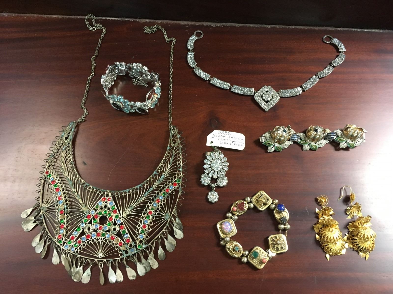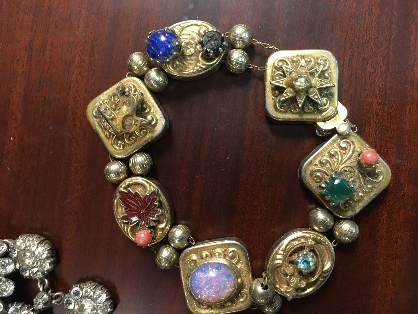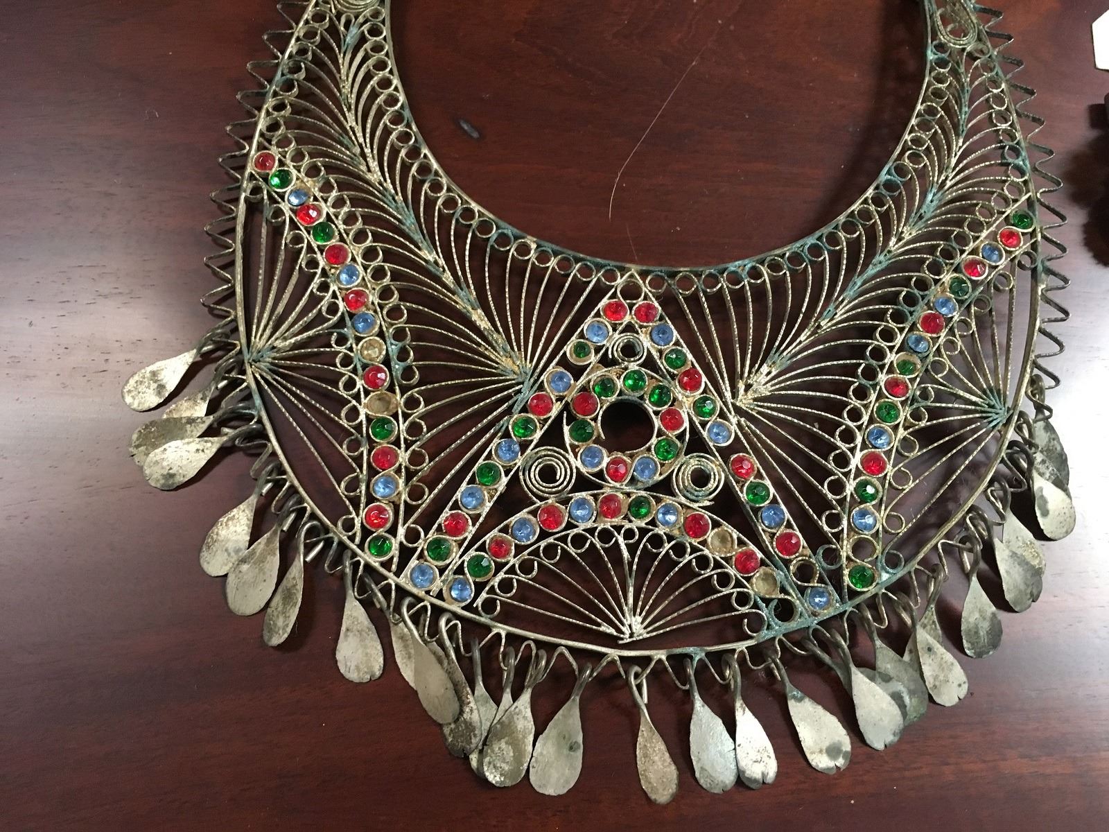 Estate Jewelry lot includes Siam filagree earrings, sterling vermeil with missing earwire. 3 costume bracelets with paste stones all need reair. Large etnic with paste necklace, and early paste necklace and pendant.
