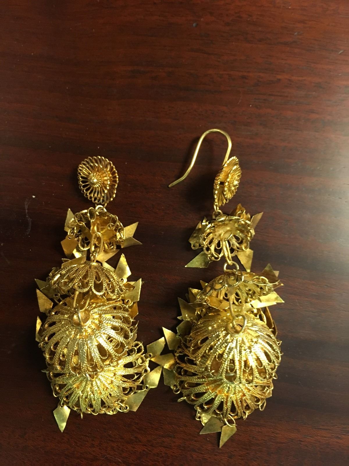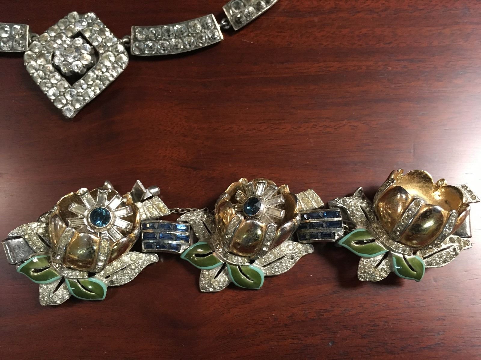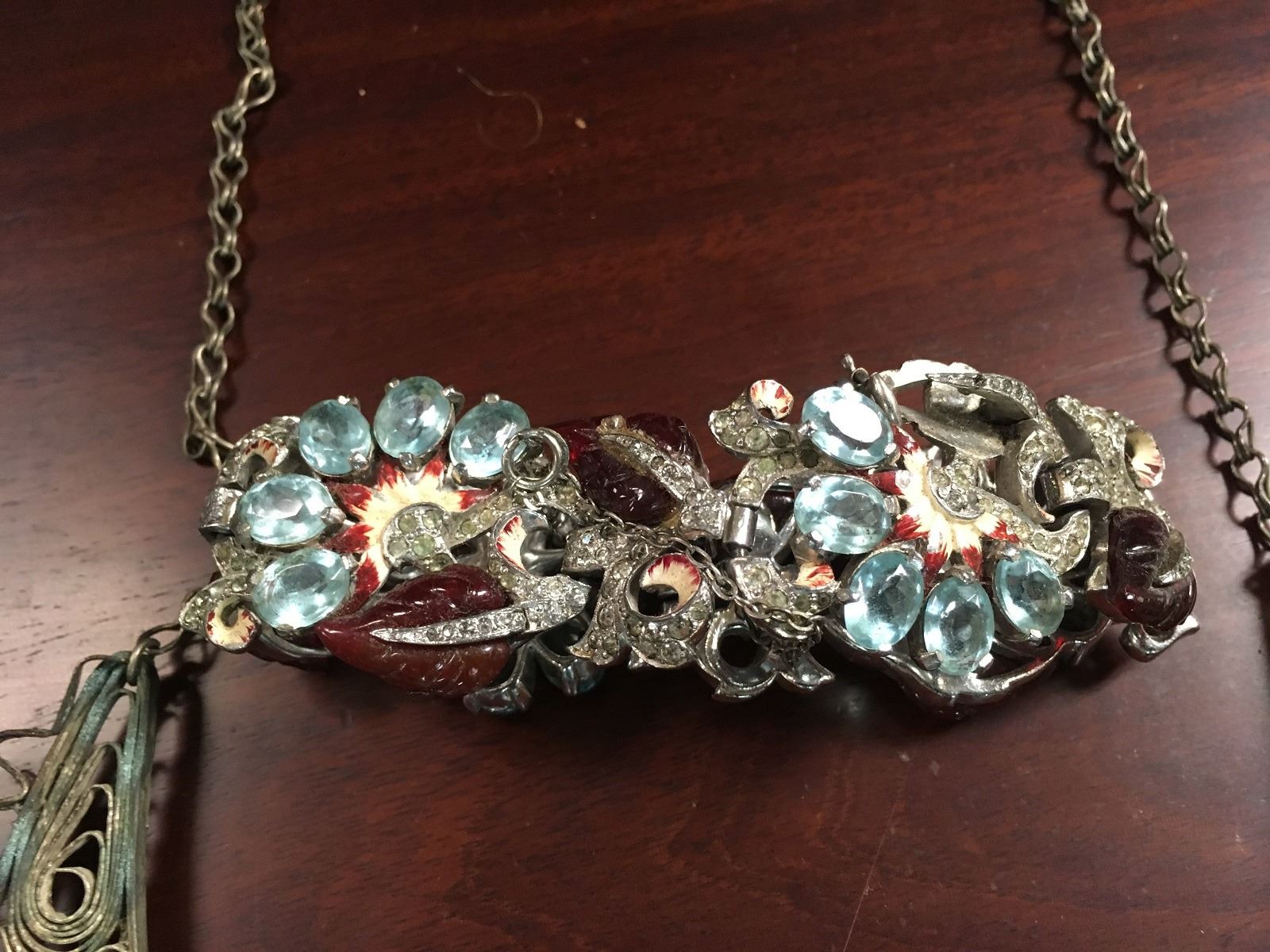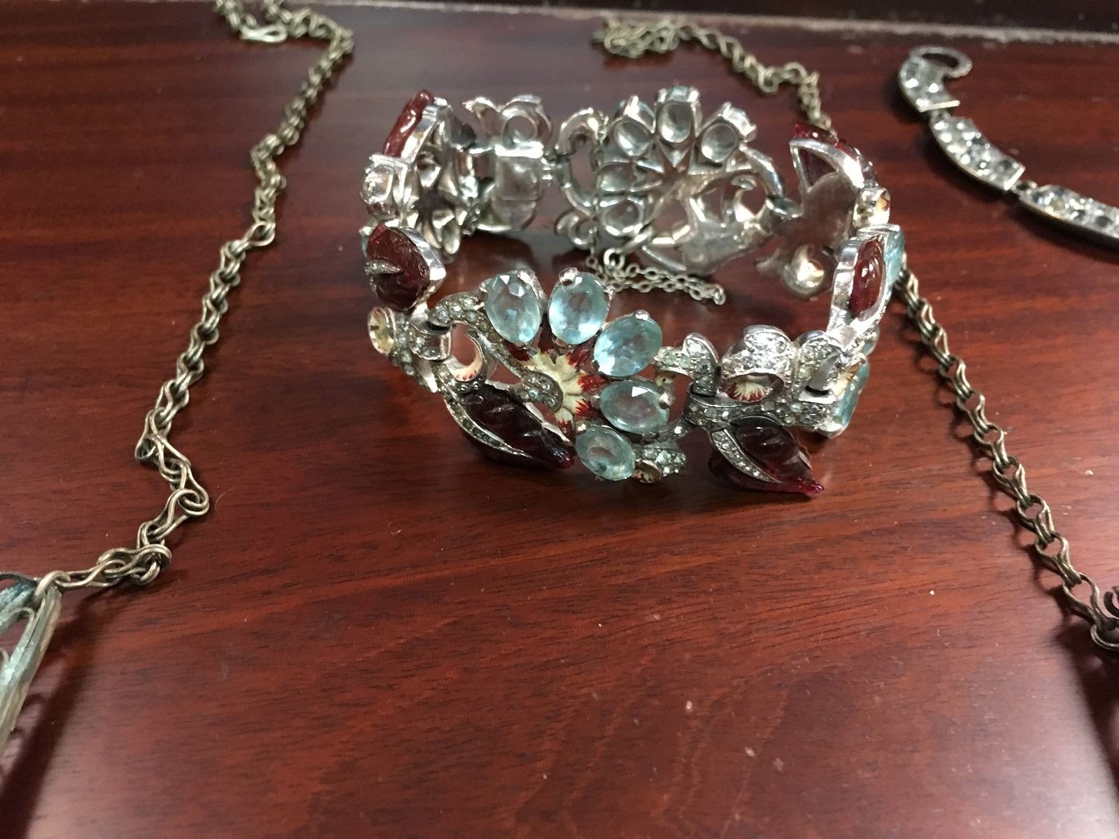 Estate Jewelry lot includes Siam filagree earrings, sterling vermeil with missing earwire. 3 costume bracelets with paste stones all need reair. Large etnic with paste necklace, and early paste necklace and pendant.