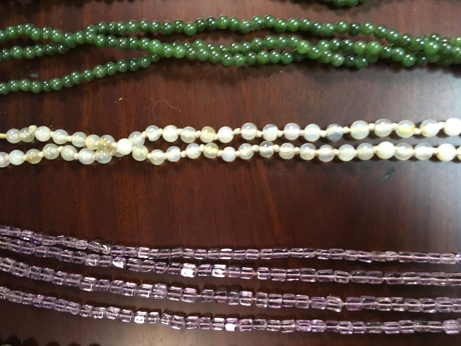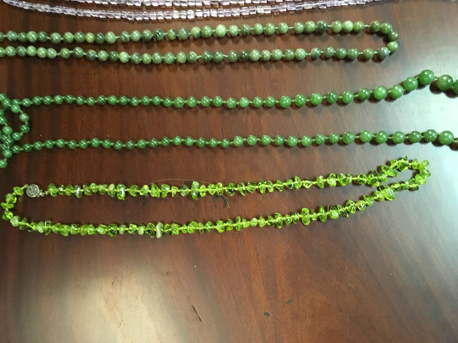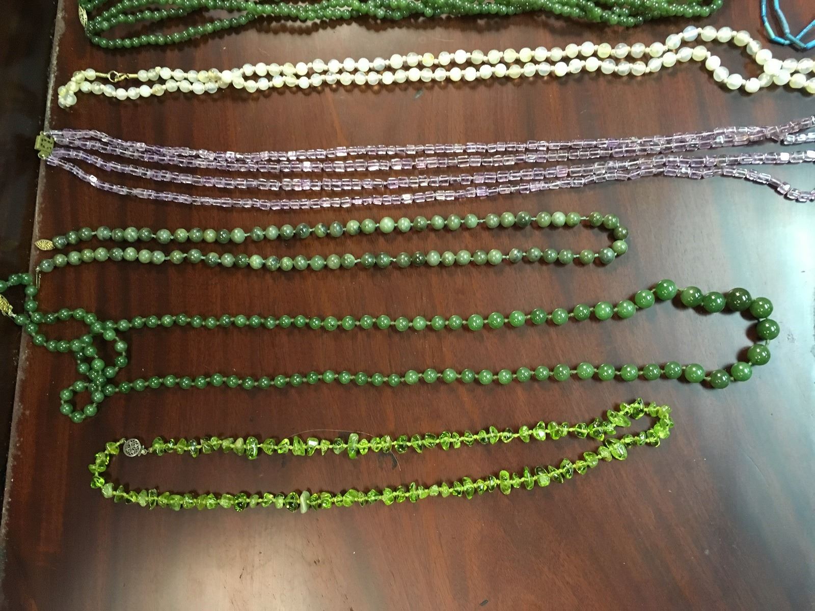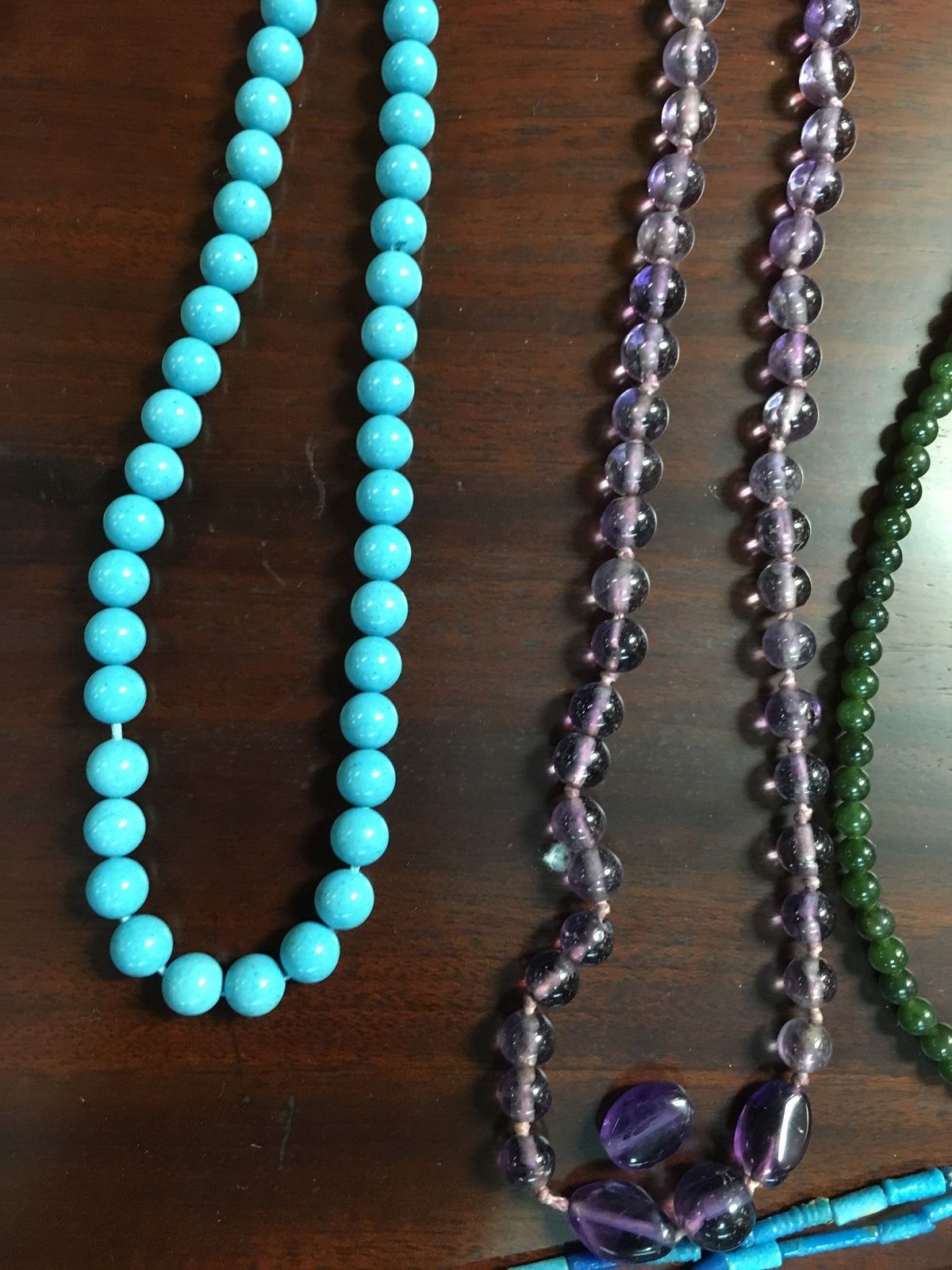 Crafters lot of stone necklaces, including amethyst, turquise, and jade, some in need of repair.