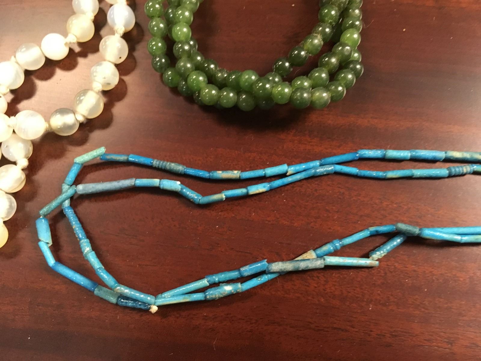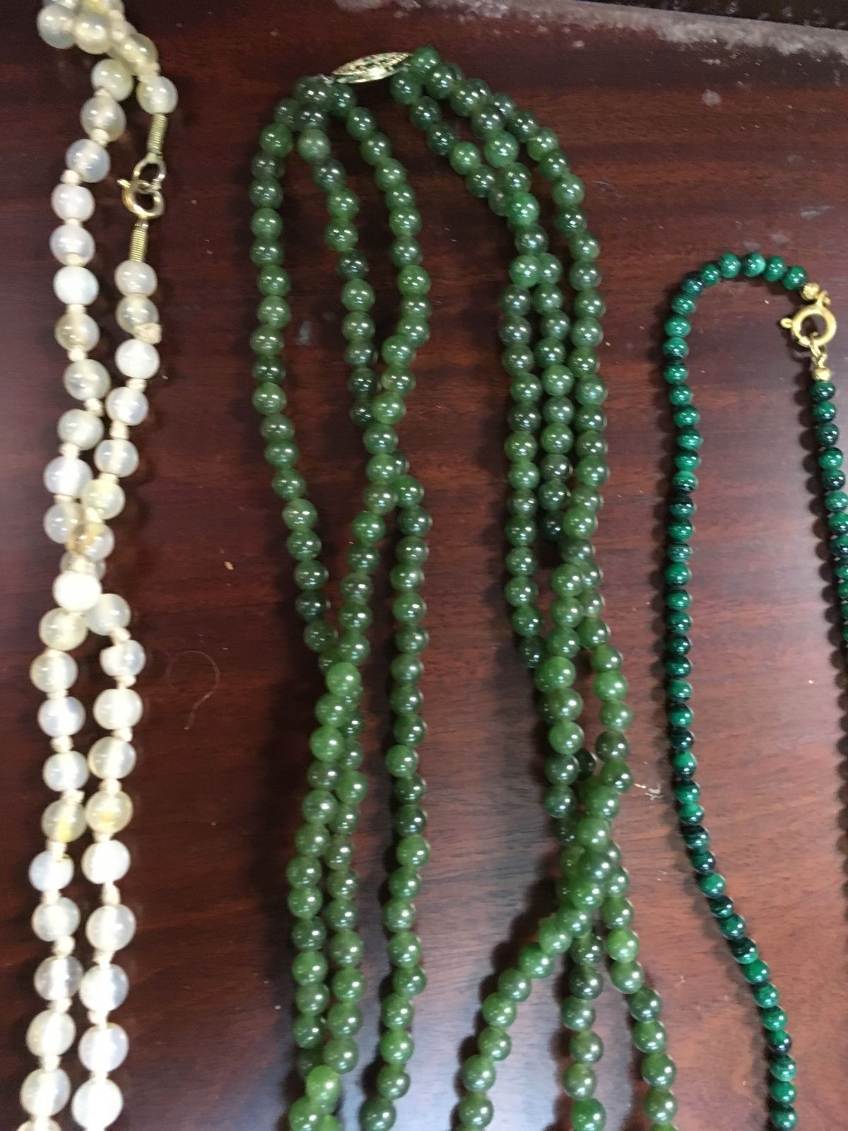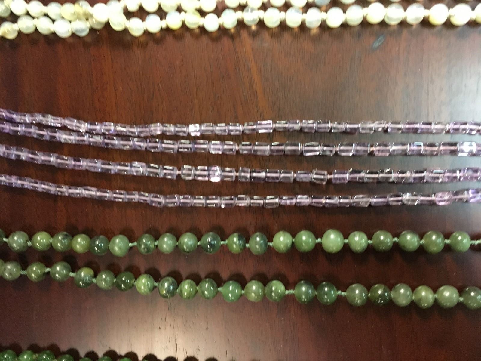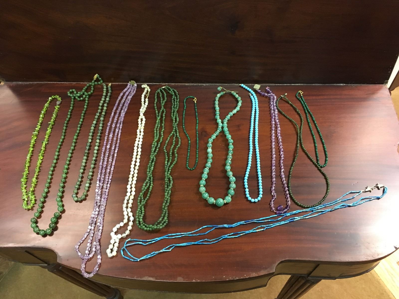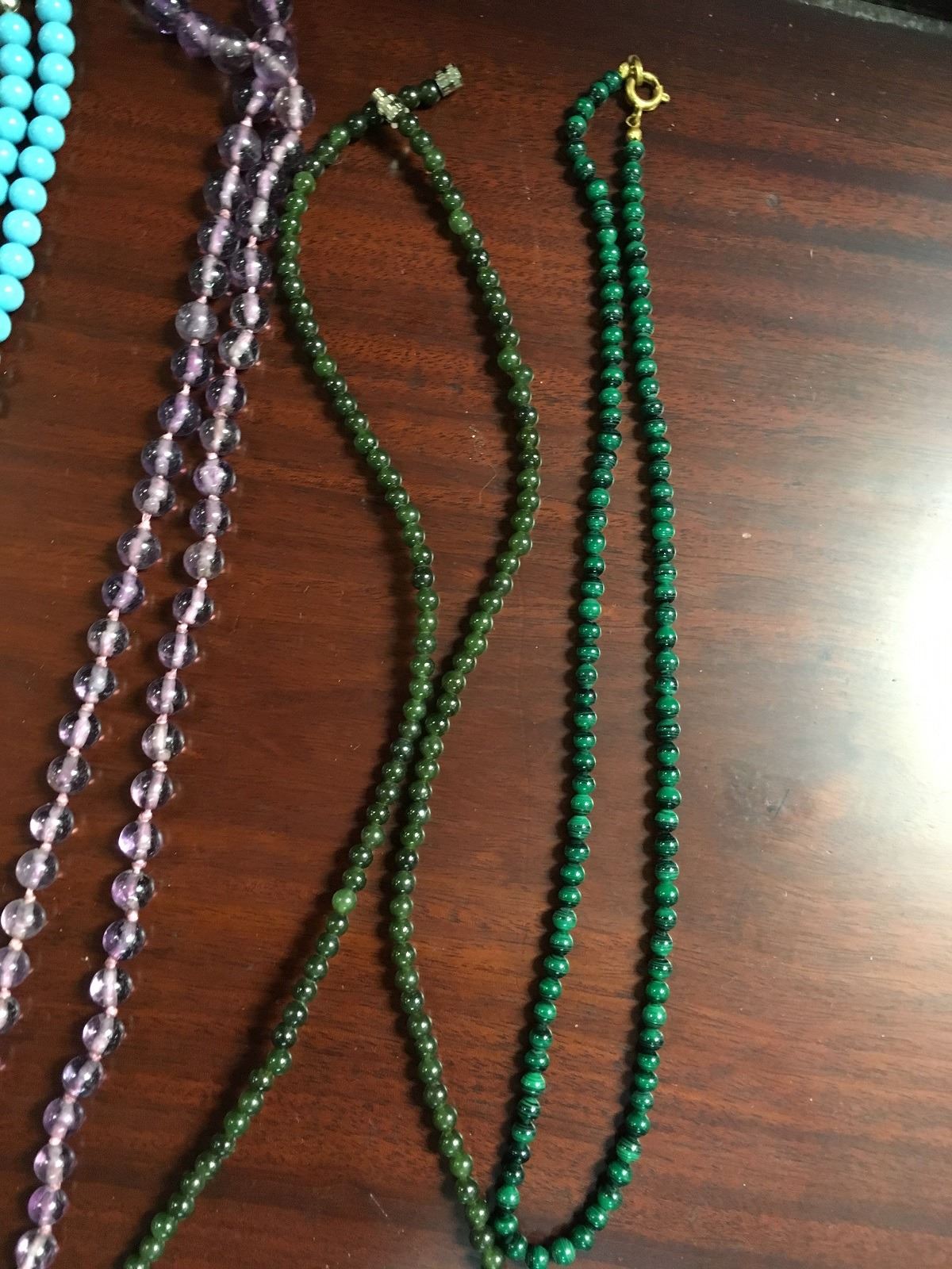 Crafters lot of stone necklaces, including amethyst, turquise, and jade, some in need of repair.