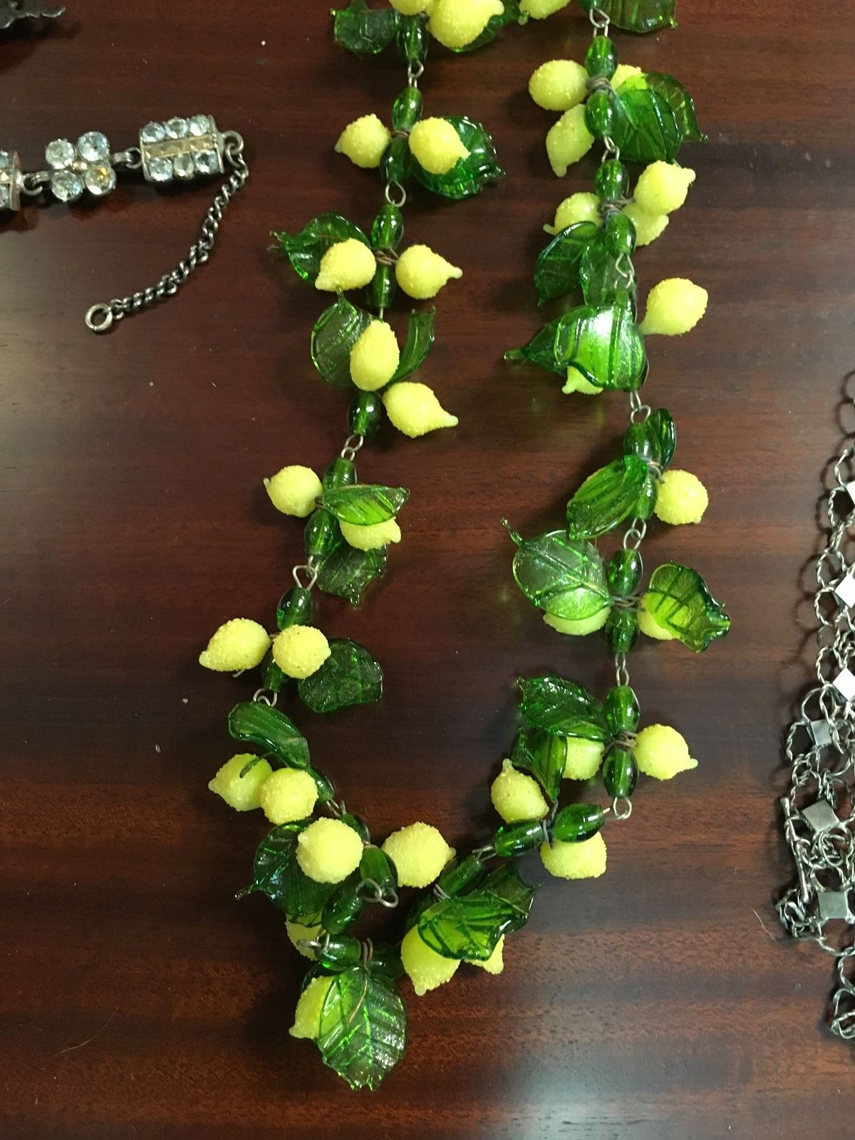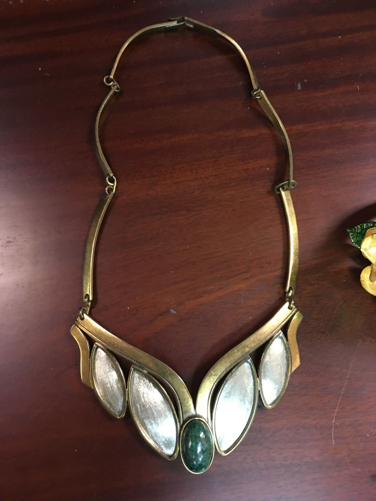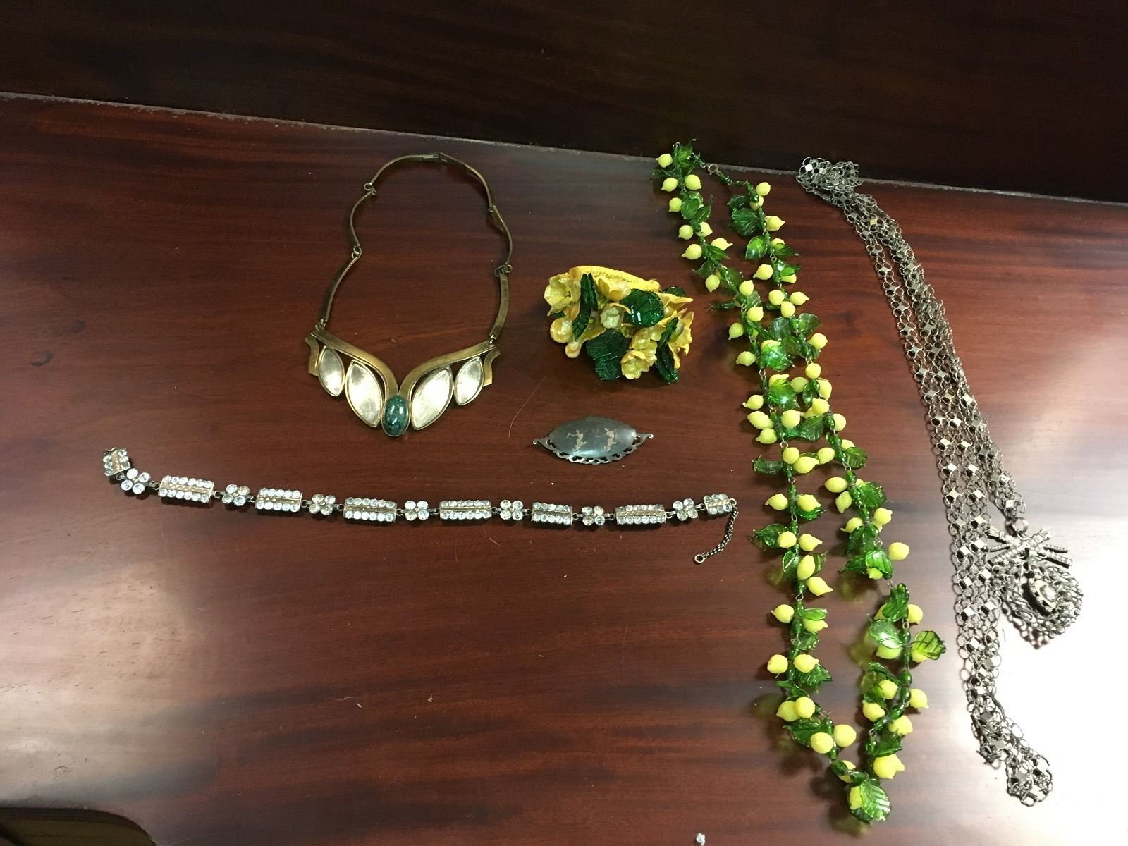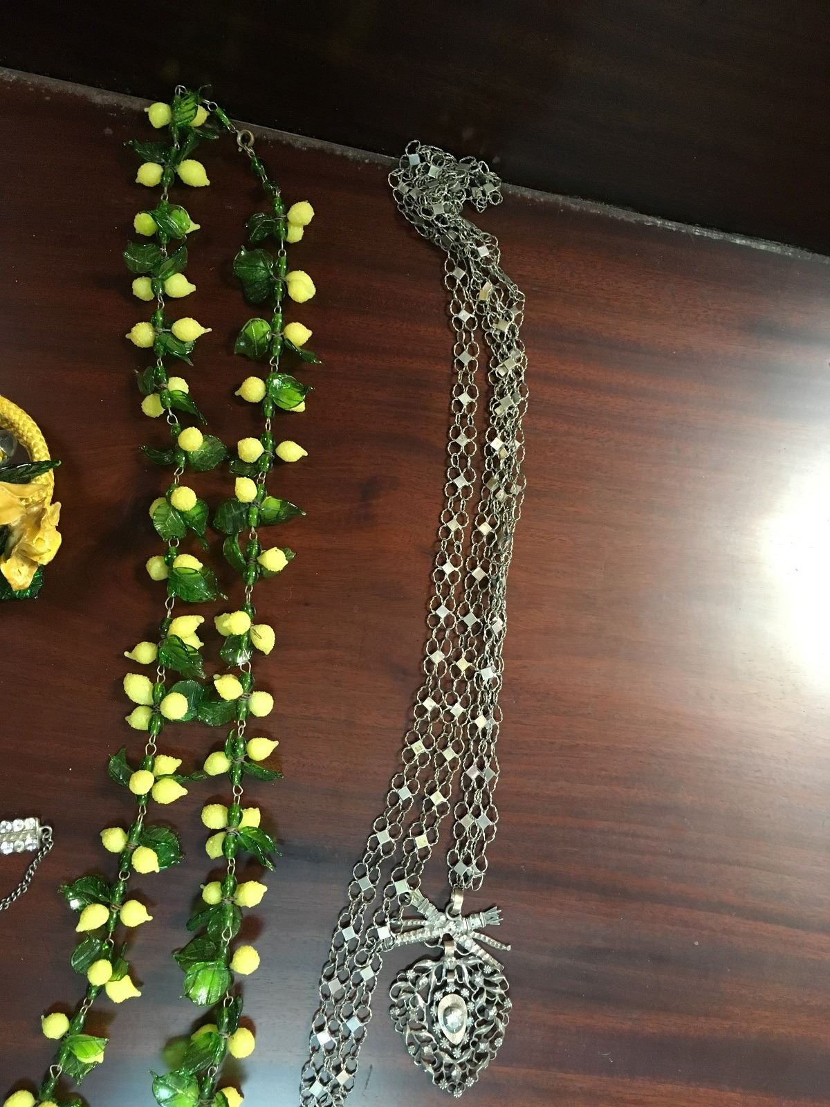 Estate jewelry lot includes paste, glass and modernist necklace including sian nielo pin, heart with rose cut diamonds.