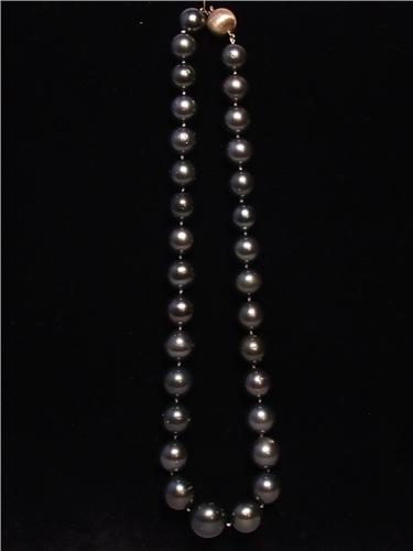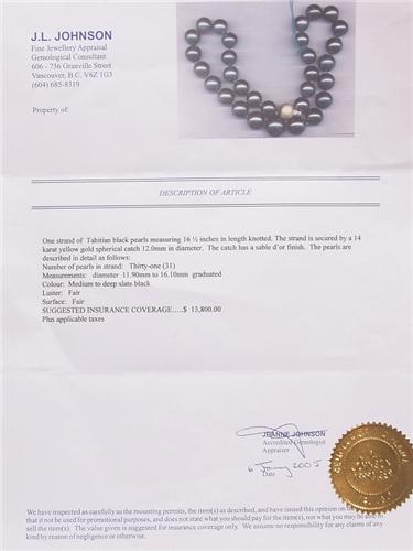 Description: Tahitian South Seas Black Pearls (31) 11.90 mm to 16.1 mm. Appraised $13,800.