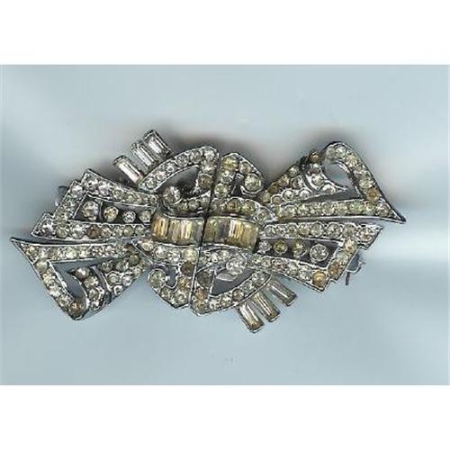 This "Duet" brooch comes apart to make two dress clips. circa 1930. Some yellowing to the stones.Rhodium backing.